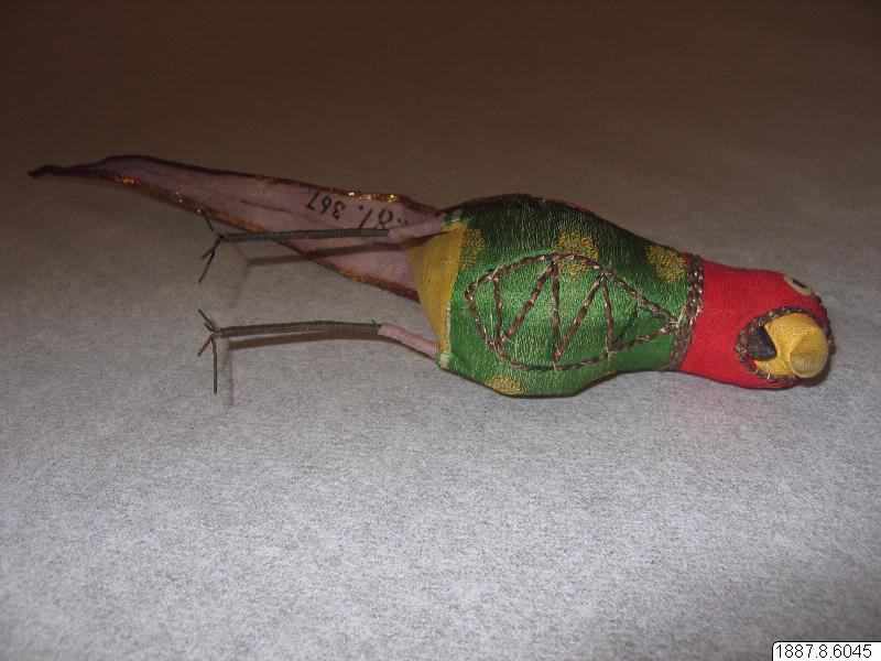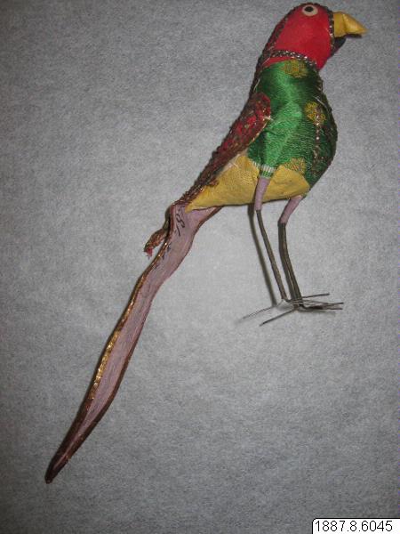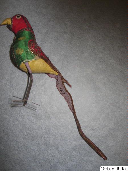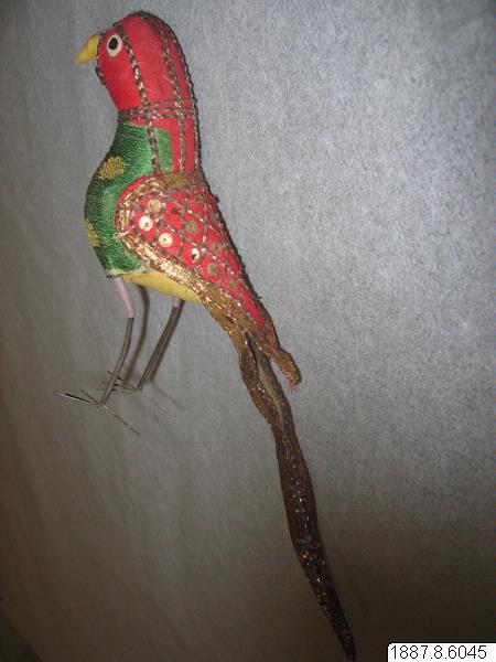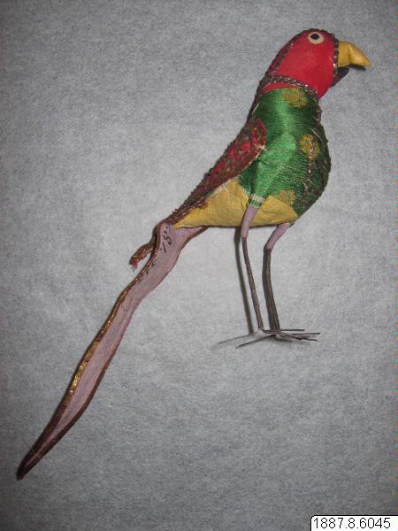 Fågel tillverkad av textil i grönt,rött och gult, ben av tunna metalltenar. Fylld med stoppmatreal, dekorerad med band i metalltråd och paljetter.