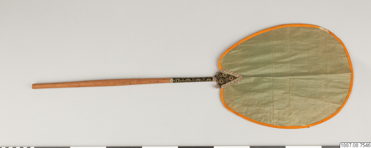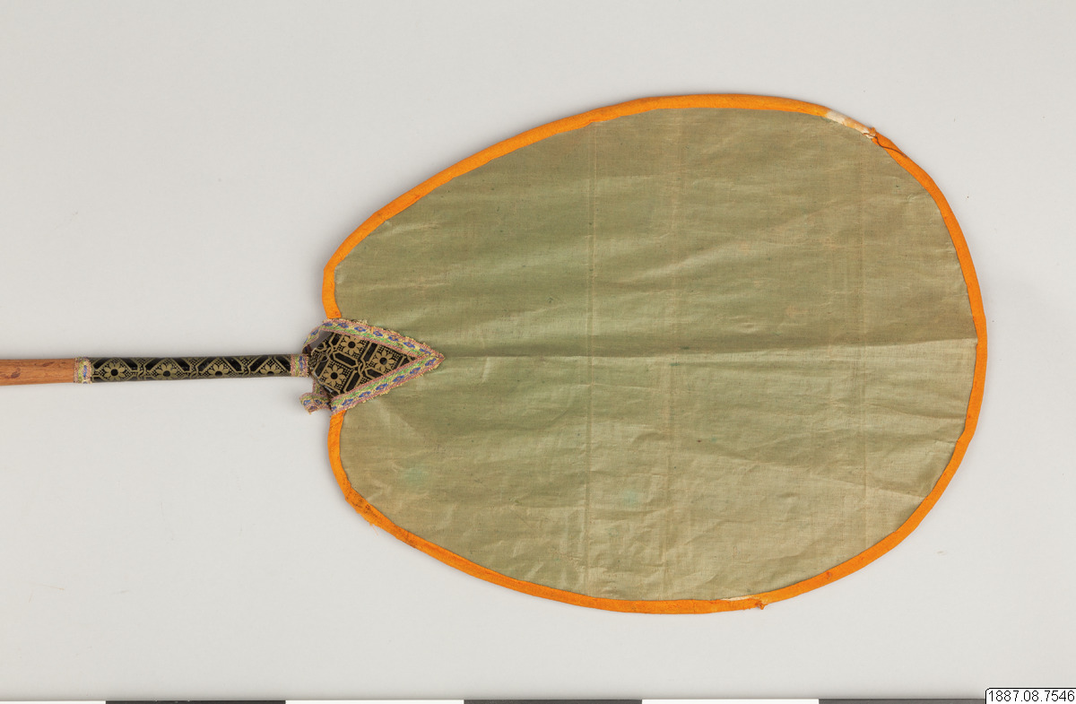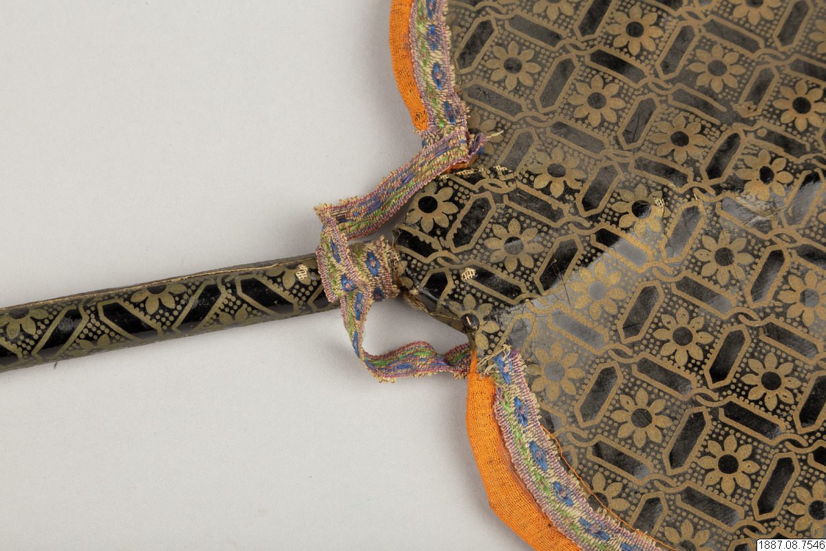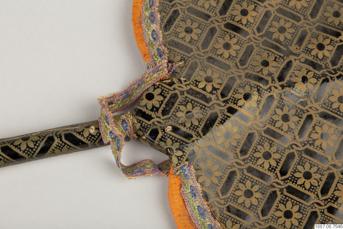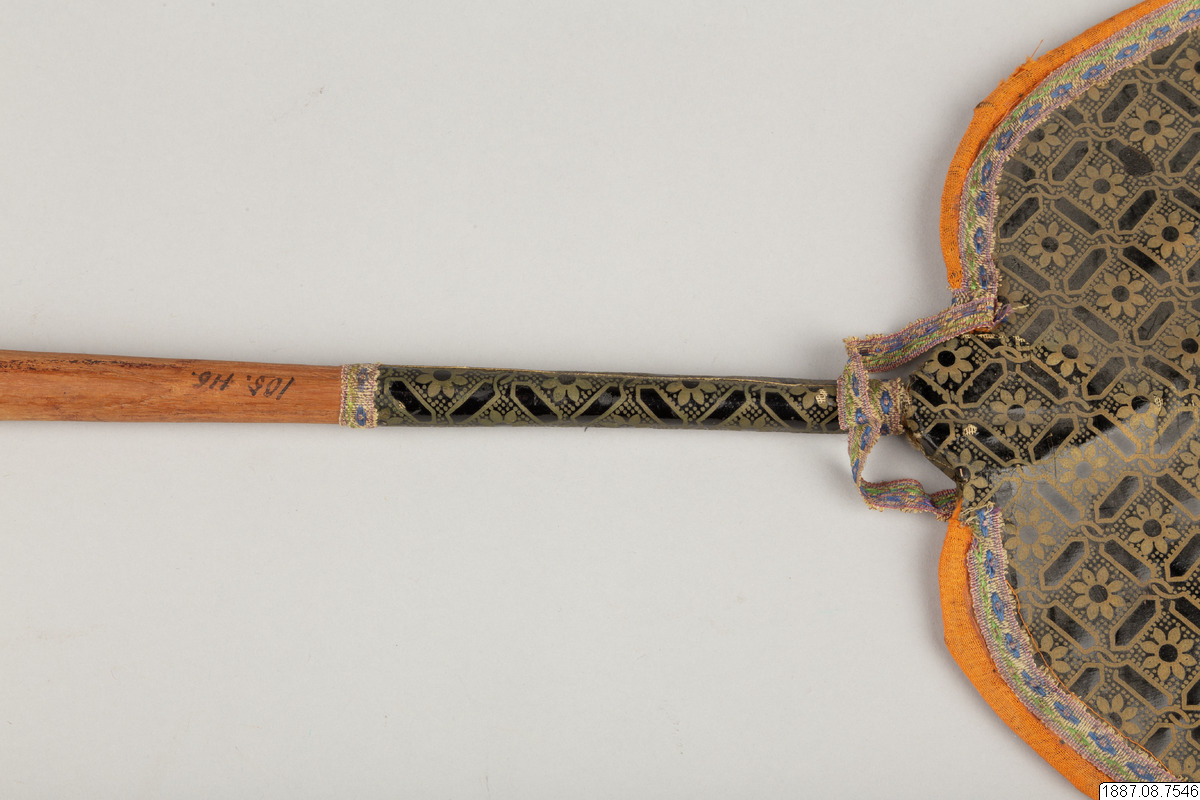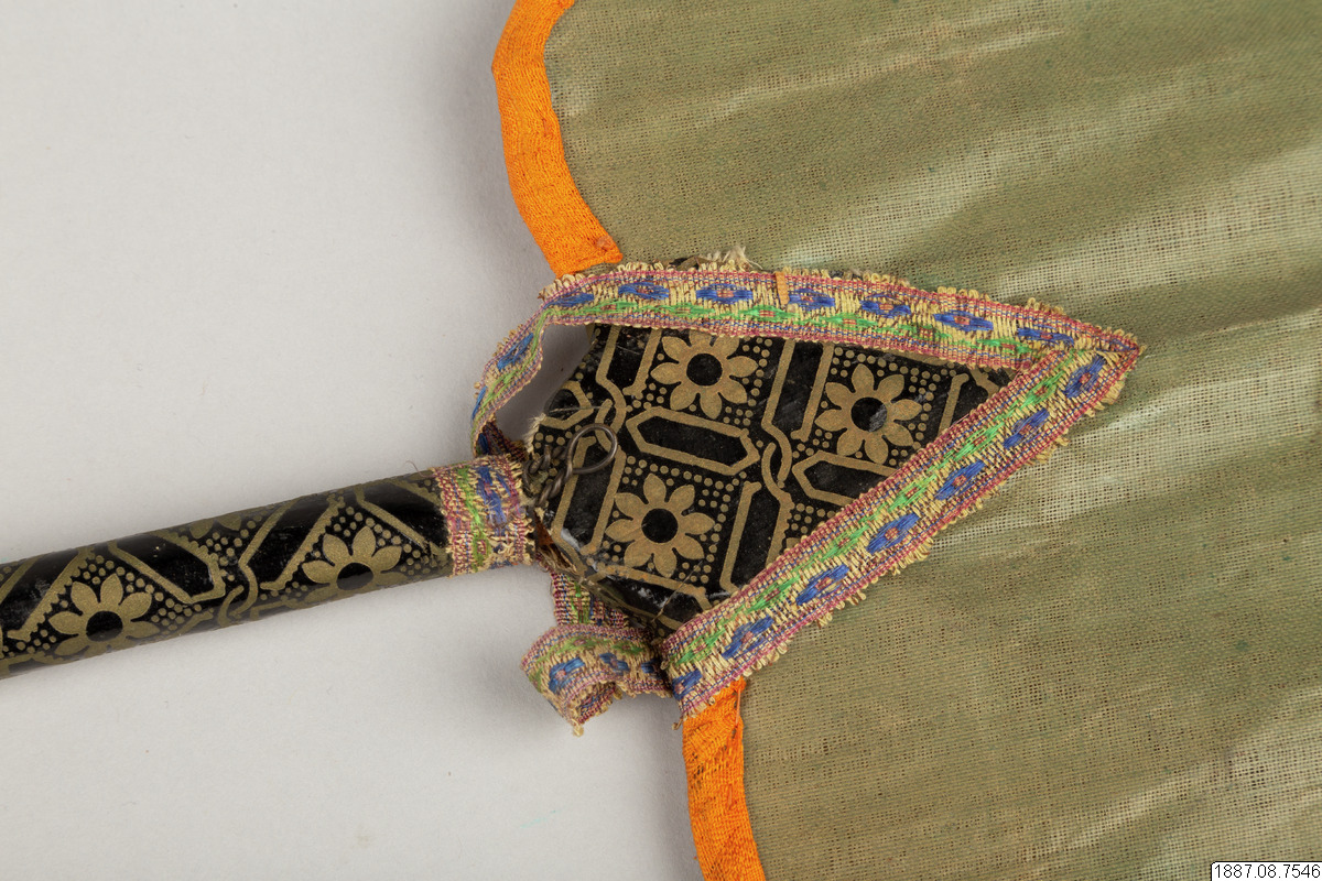 Solfjäder för präst. Med stomme av bambu och hållare av trä, framsidan täckt med vaxduk? eller lackduk? i svart med guldtryck, baksidan är täckt med grön bomullschinzt. Orange sidenkantband fastsydda runt kanterna, snörmakeriband limmade över framsidans kanter.