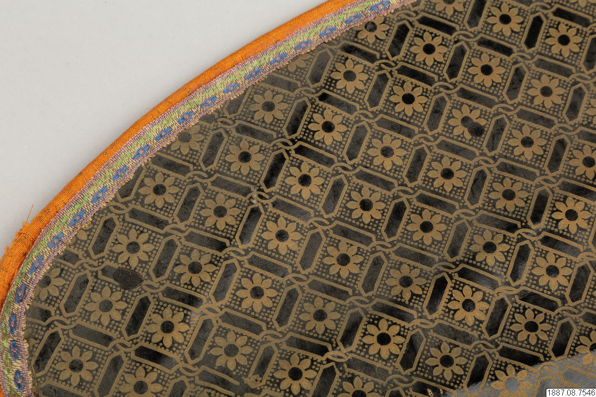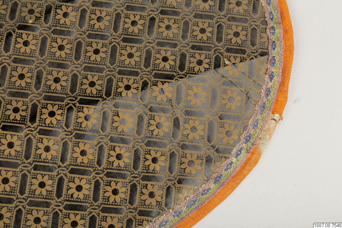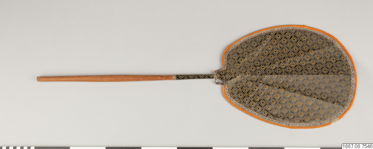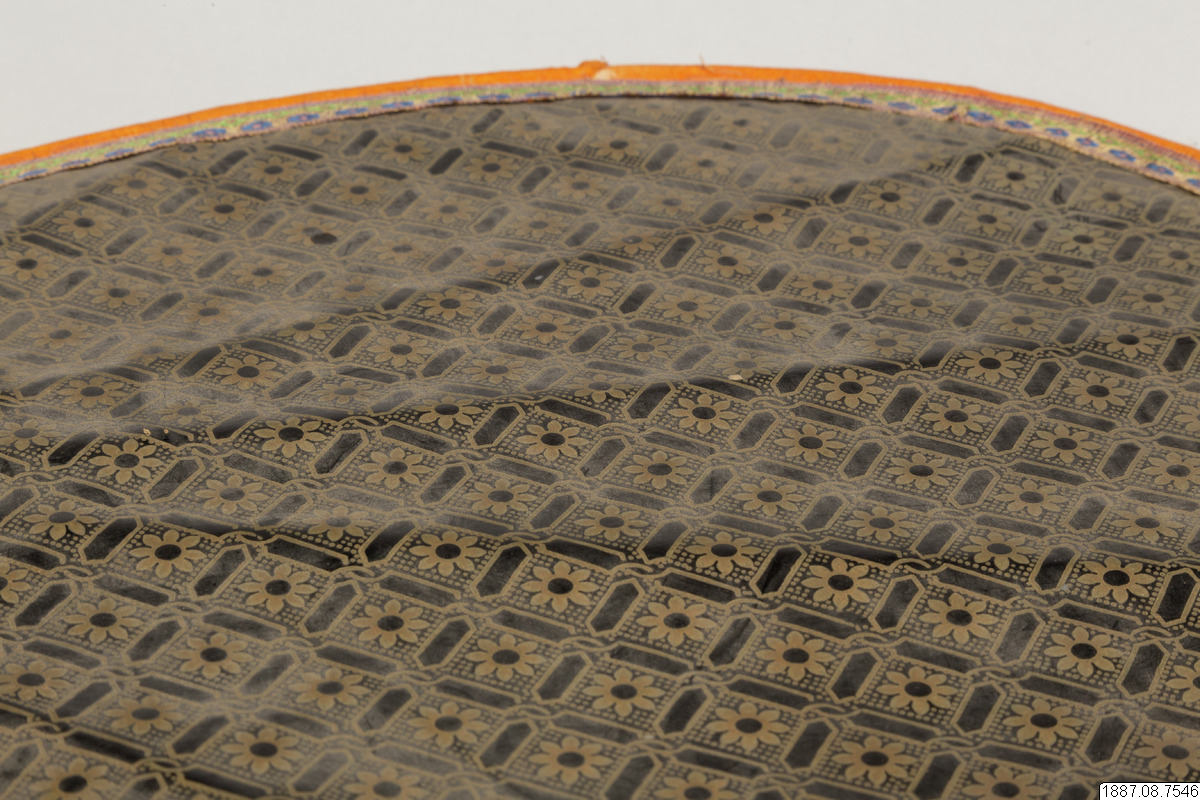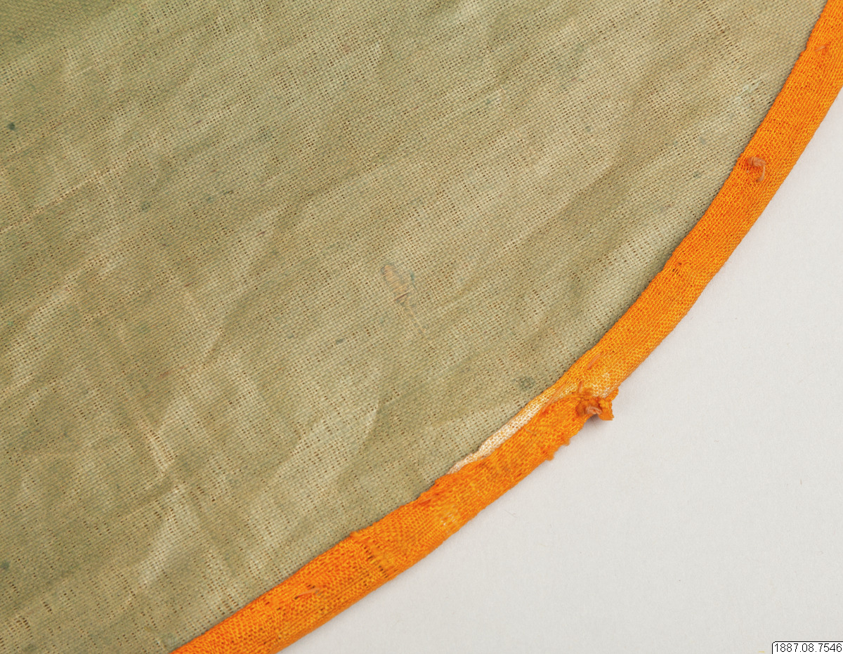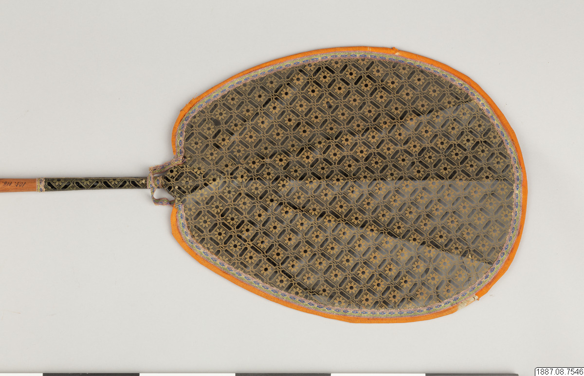 Solfjäder för präst. Med stomme av bambu och hållare av trä, framsidan täckt med vaxduk? eller lackduk? i svart med guldtryck, baksidan är täckt med grön bomullschinzt. Orange sidenkantband fastsydda runt kanterna, snörmakeriband limmade över framsidans kanter.