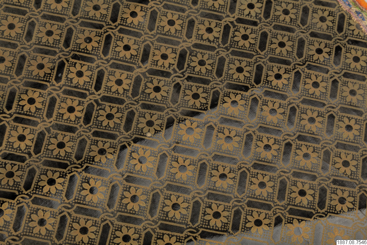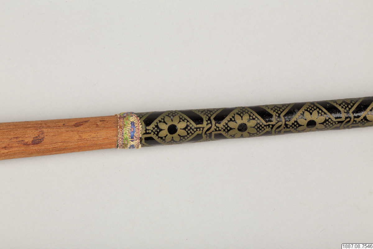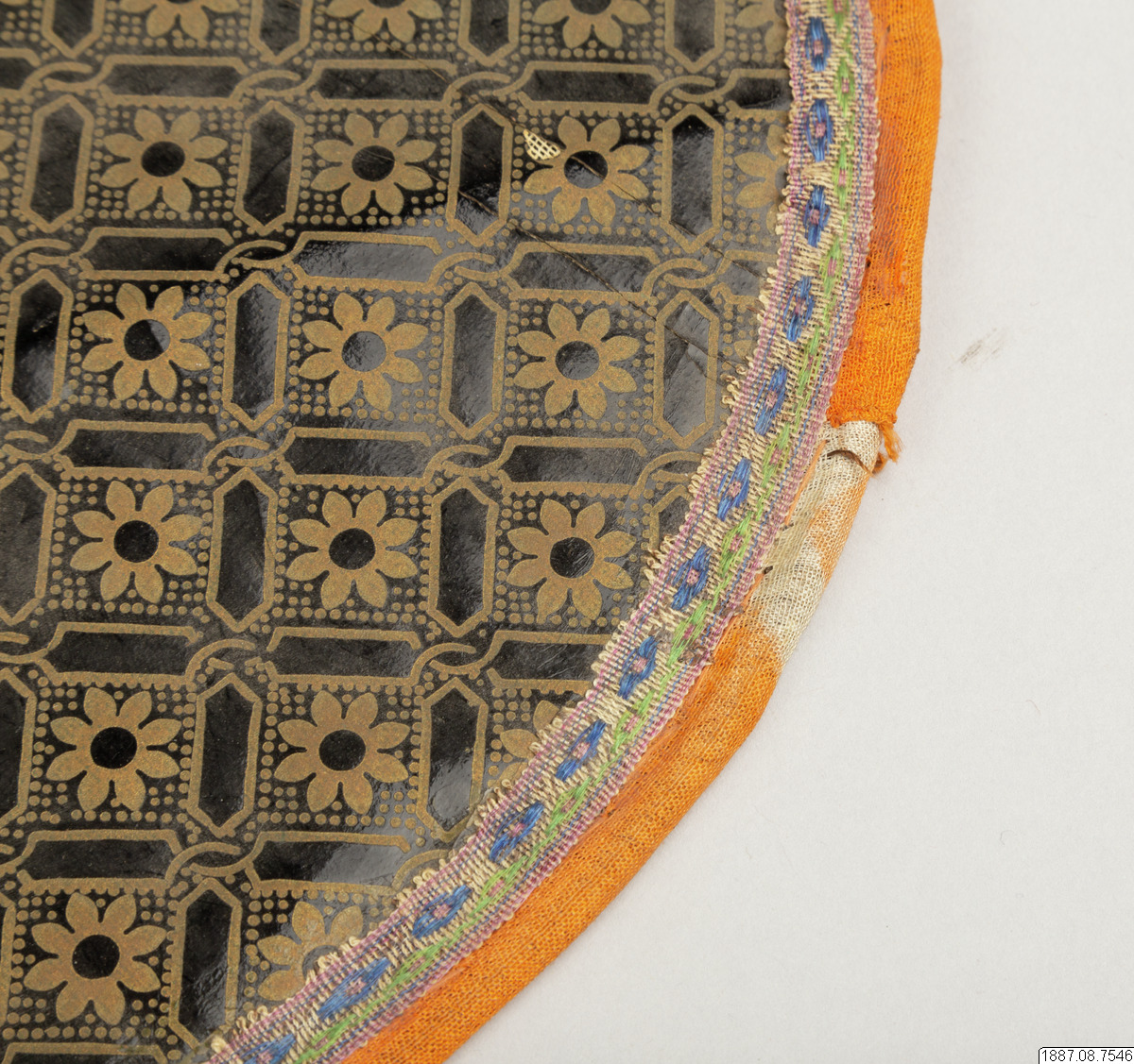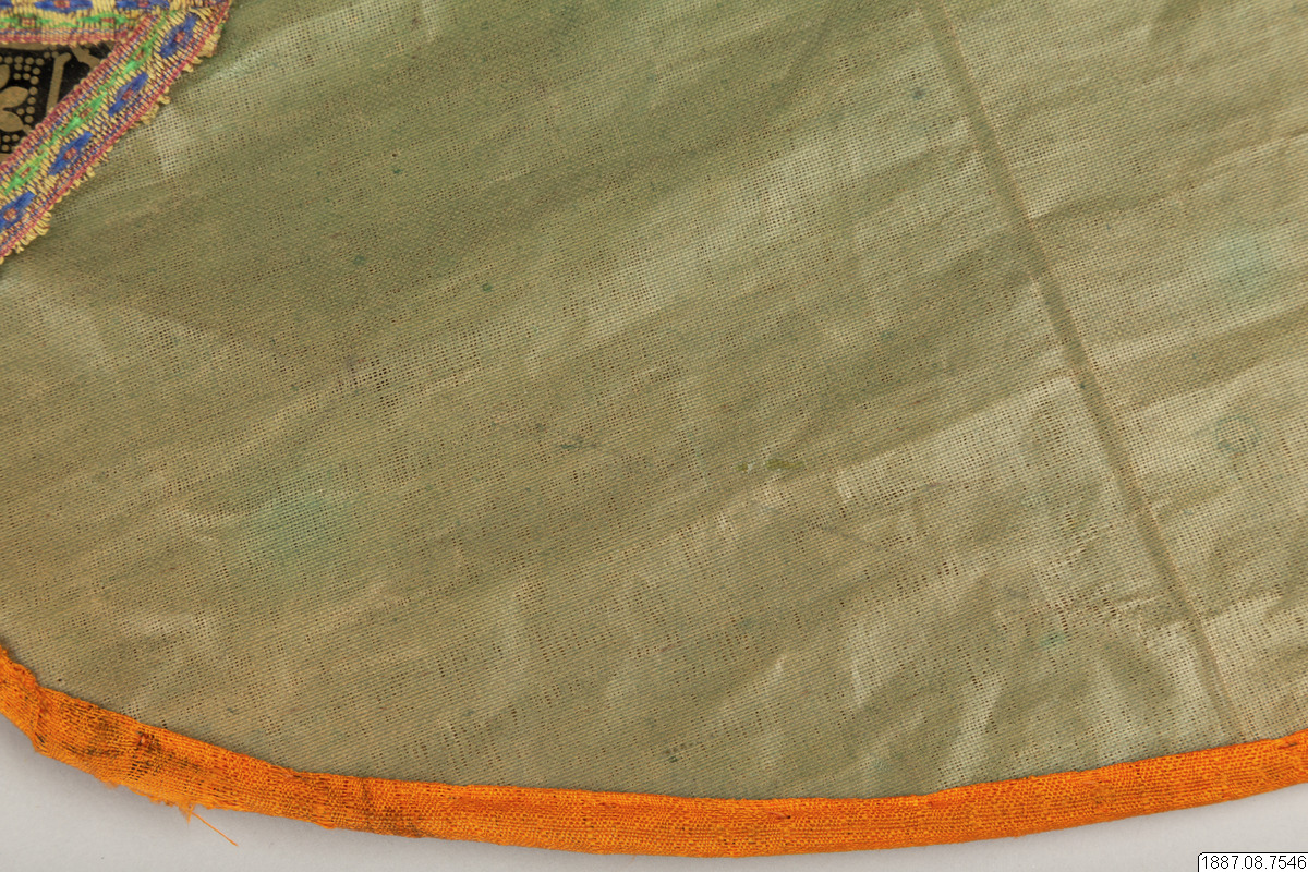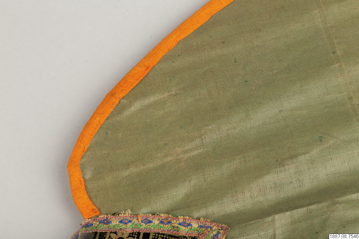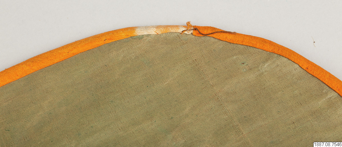 Solfjäder för präst. Med stomme av bambu och hållare av trä, framsidan täckt med vaxduk? eller lackduk? i svart med guldtryck, baksidan är täckt med grön bomullschinzt. Orange sidenkantband fastsydda runt kanterna, snörmakeriband limmade över framsidans kanter.