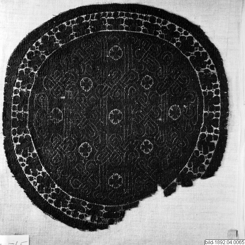 • Vävnadsfragment. Rundel i gobelängteknik med delvis insnärjd teckning. Ursprungligen omgiven av lärft. (generalkatalog)