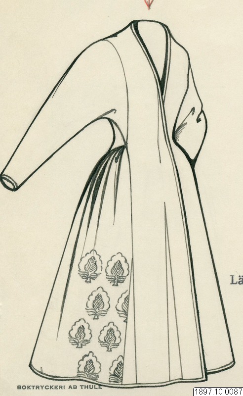 Kvinnorock, röd. /generalkatalogen Rock av rött siden med mönster vävt med guld-, silver- och grönfärgat inslag. Långa ärmar, öppen fram, och med veck i midjan, vid höfterna. Kilar i kjoldelen och slitsar i sidorna. Rocken är fodrad med grönmönstrat, randigt tyg. EM