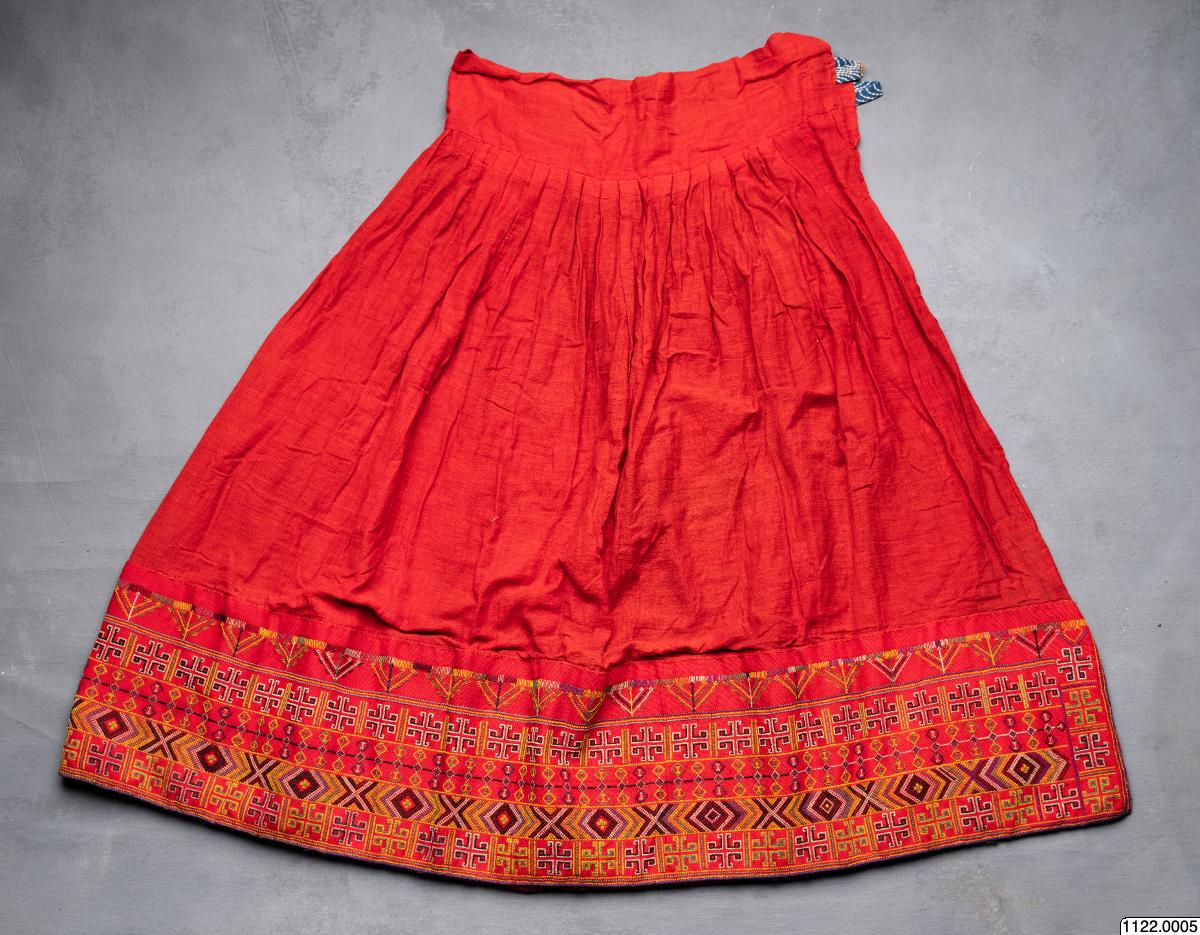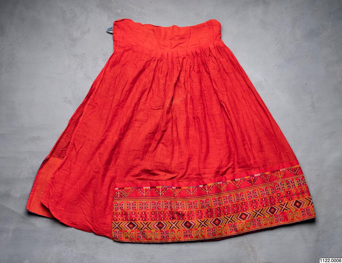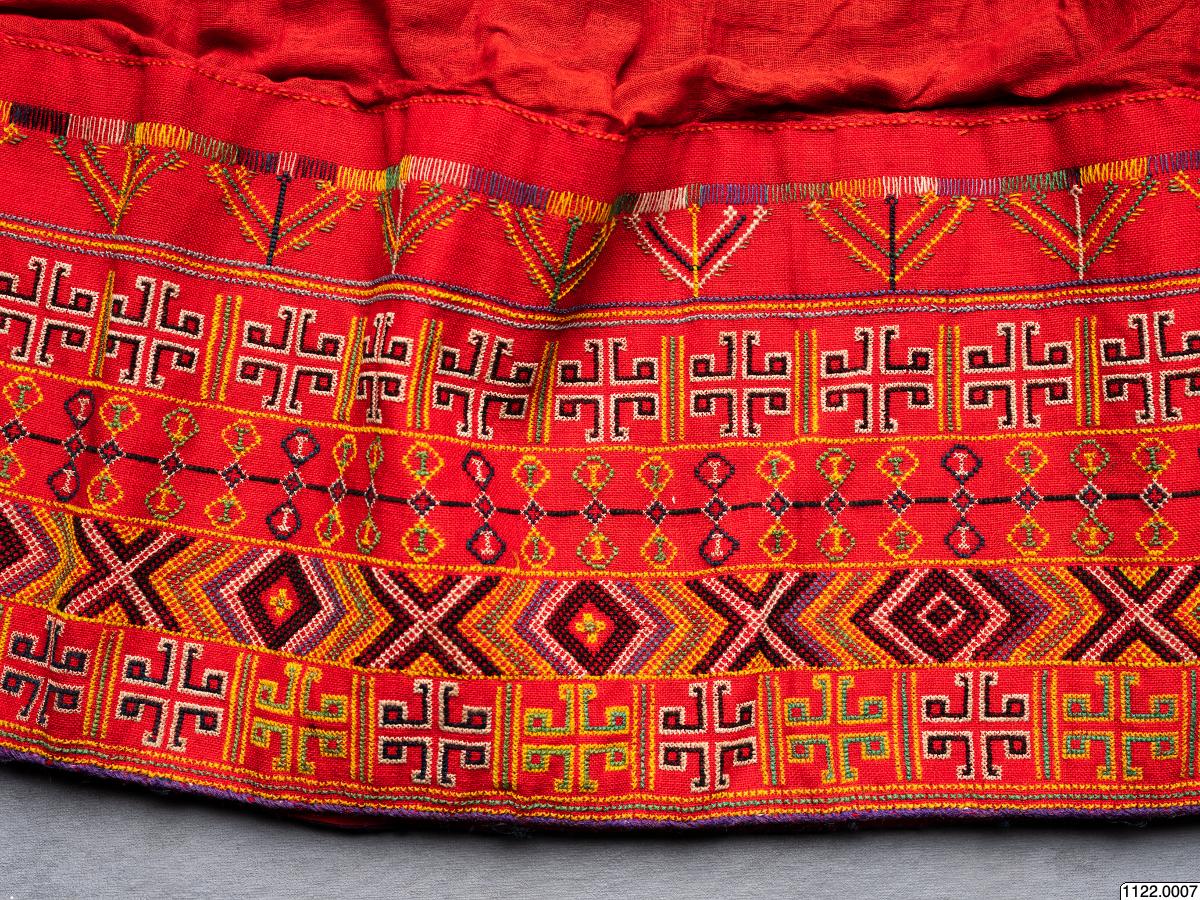 för kvinna, av rött ylle. Den breda bårdan är broderad i korsstygn med rött,,gult, blått, vitt och svart yllegarn. Längd: 78 cm Chakobokoboji Chibuto [ocr]