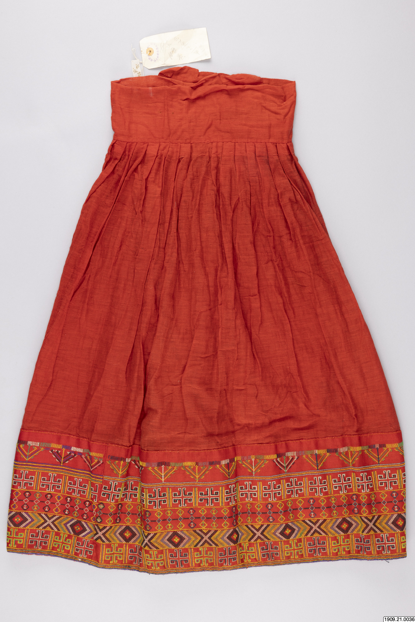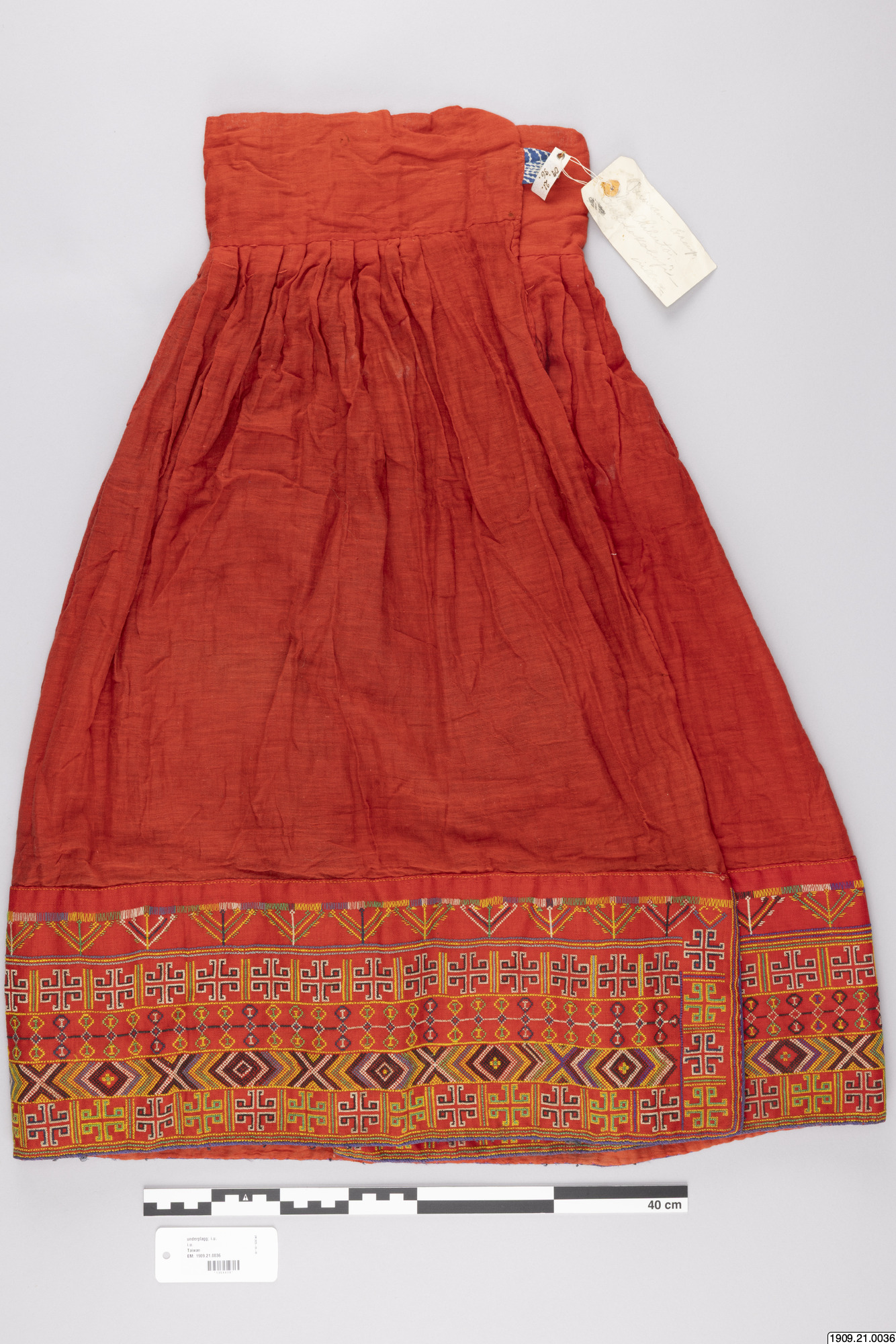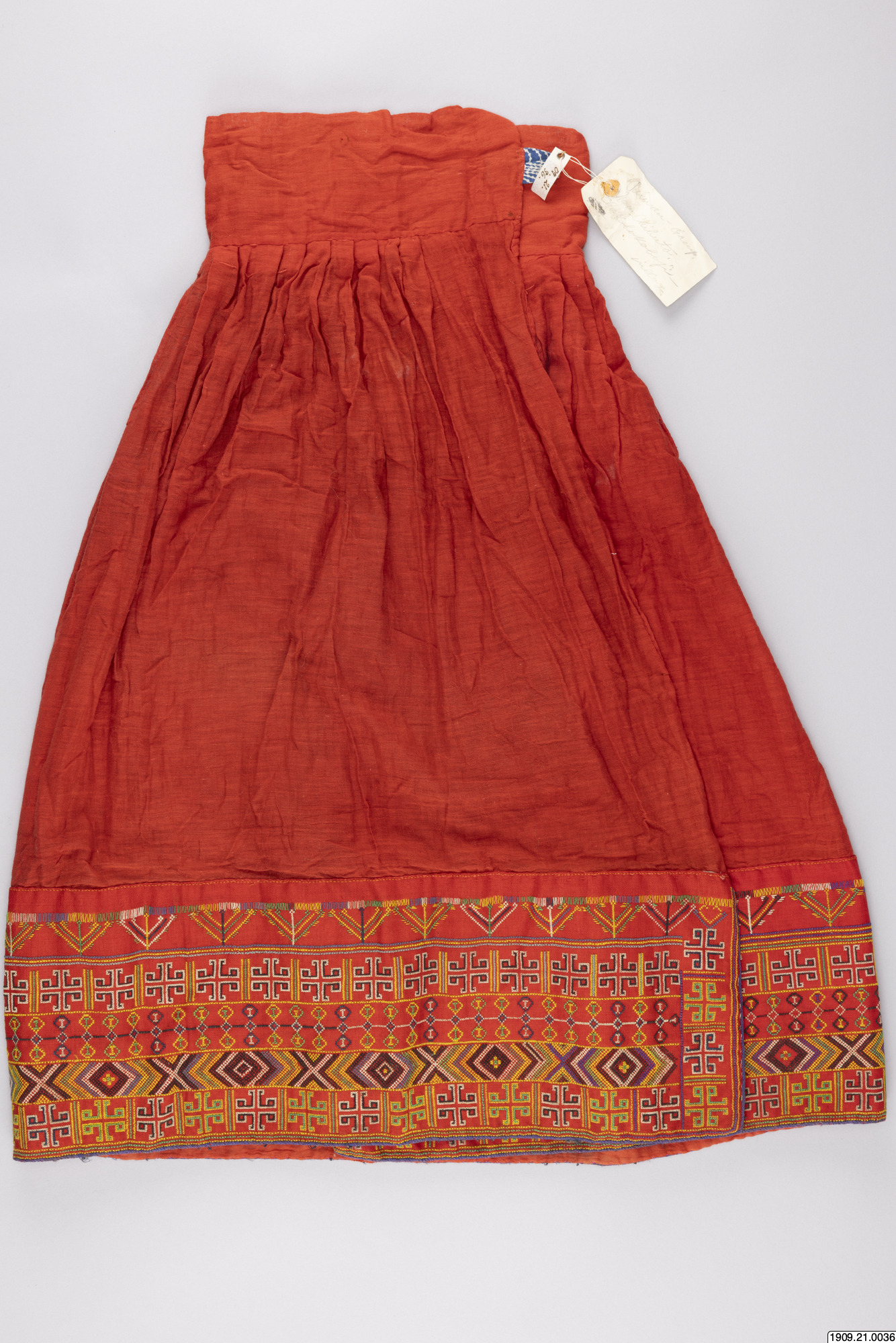 för kvinna, av rött ylle. Den breda bårdan är broderad i korsstygn med rött,,gult, blått, vitt och svart yllegarn. Längd: 78 cm Chakobokoboji Chibuto [ocr]