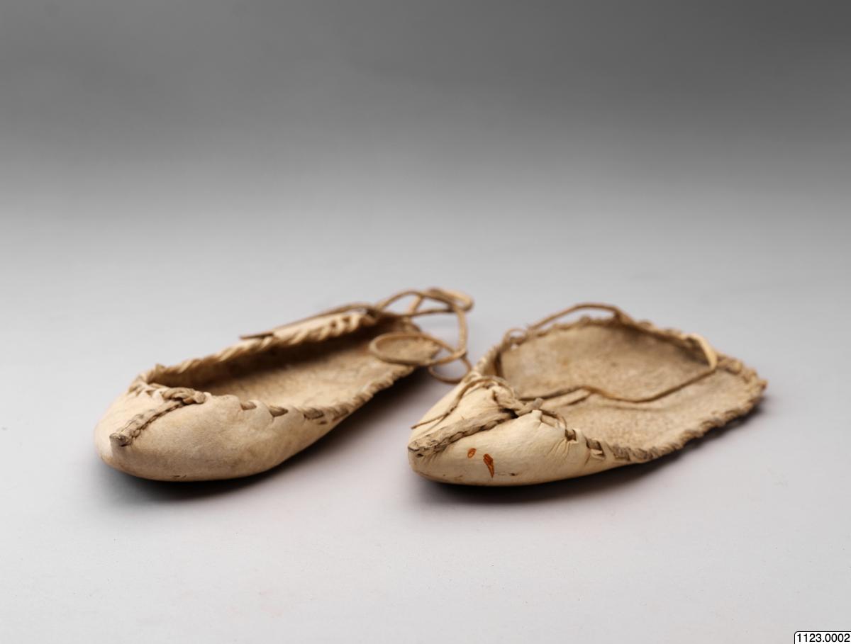 Vit lädersko, skuren i ett stycke. Hål uppskurna kring "öppningen", i dessa är sedan en läderem dragen som används för att sluta åt skon mot foten och knyta vid vristen. En söm framtill skapar "skoformen". Enligt katalog inköpta vid basaren i Bagtje Saraj.