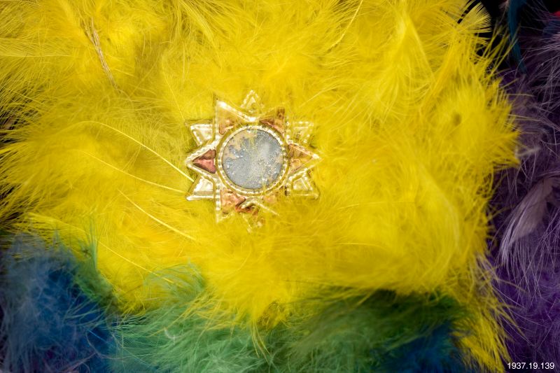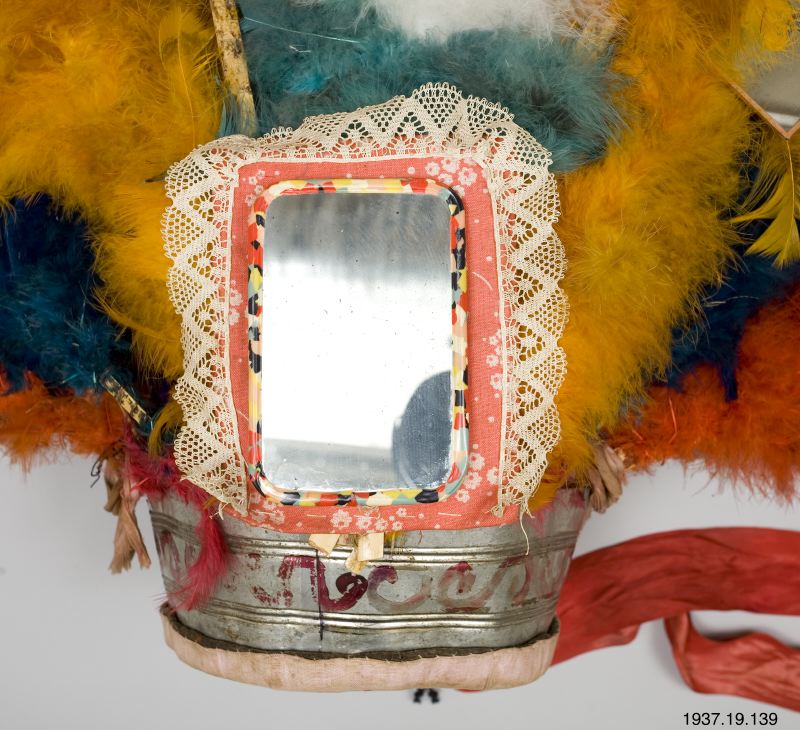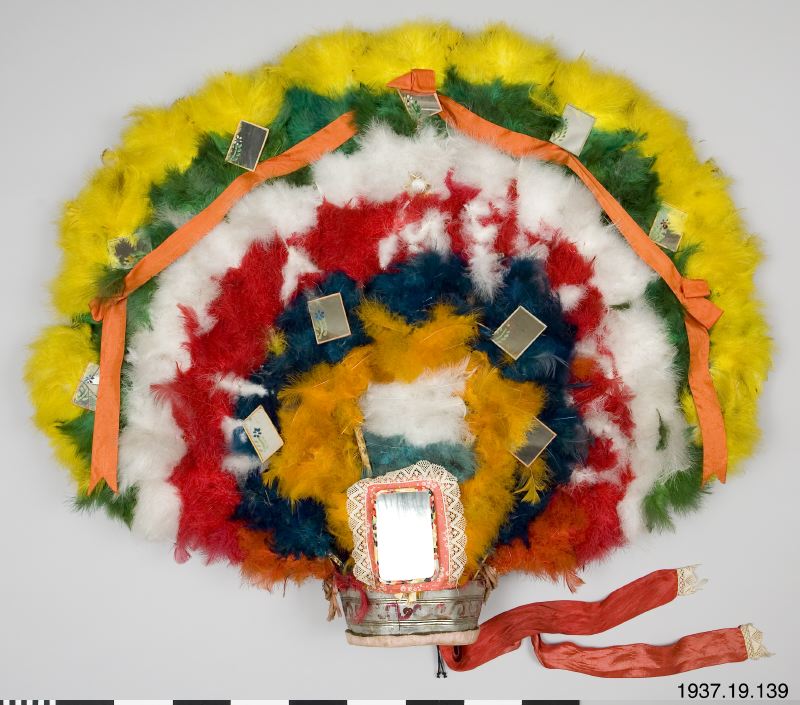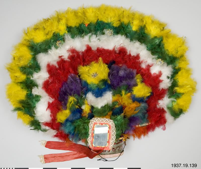 Dansprydnad. Tillverkad av fjädrar i många färger fästade vid ett gallerverk av tunna spjälor. Själva kronan, som vilar på huvudet, är av bleckplåt med målade ornament. I utsmyckningen ingår tretton stycken rektangulära speglar samt fyra små stjärnor av metall med runda speglar i mitten. Fjädrarna är färgade utifrån kanten räknat i gult, grönt, vitt, rött, blått och brandgult. Prydnadsband av rött...