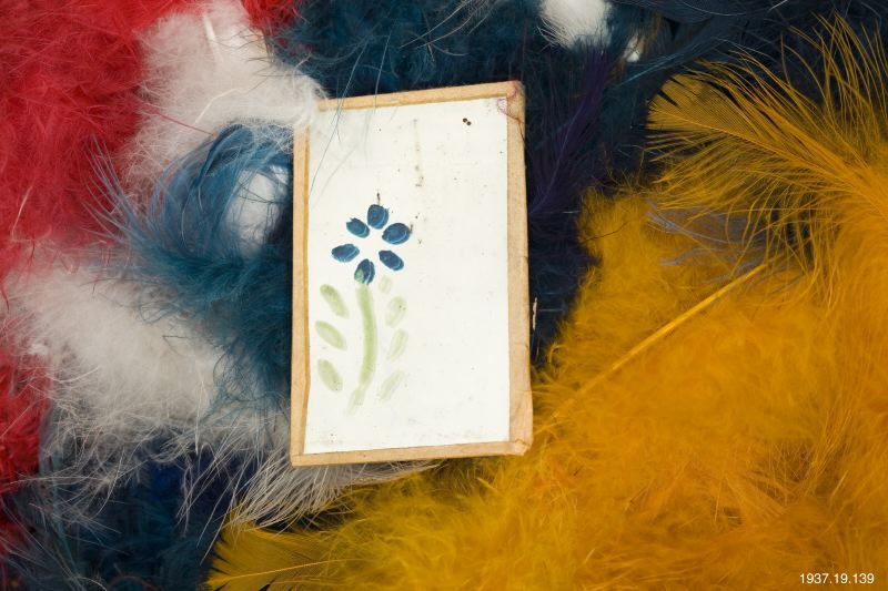 Dansprydnad. Tillverkad av fjädrar i många färger fästade vid ett gallerverk av tunna spjälor. Själva kronan, som vilar på huvudet, är av bleckplåt med målade ornament. I utsmyckningen ingår tretton stycken rektangulära speglar samt fyra små stjärnor av metall med runda speglar i mitten. Fjädrarna är färgade utifrån kanten räknat i gult, grönt, vitt, rött, blått och brandgult. Prydnadsband av rött siden.