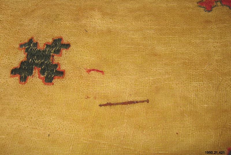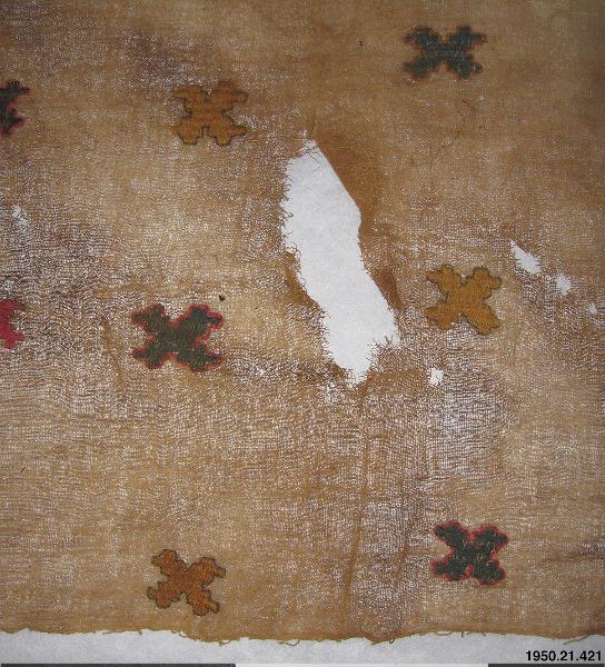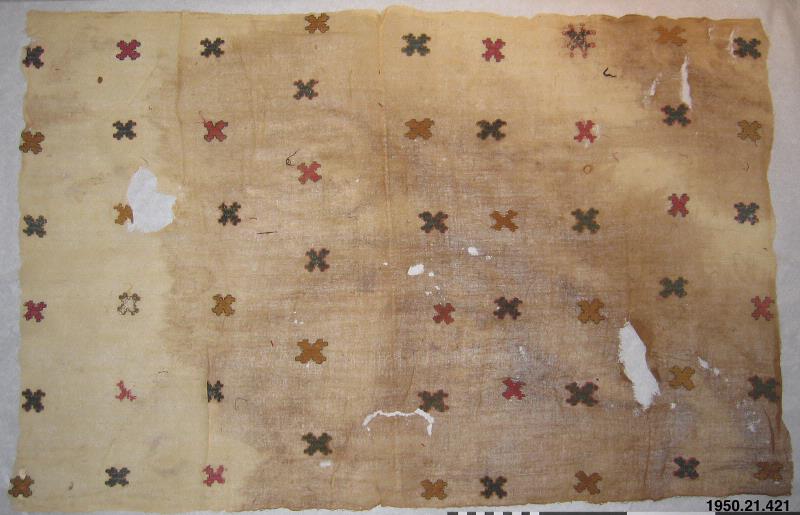 Textil med bottentyg av ljust brun tuskaftvävd bomull med glest broderade fyrsidiga ¿stjärnor¿ i olika färger. De två kortsidorna är avklippt, de andra två långsidorna har stadkanter. Fragmentet uppsytt mot gult ¿smörpapper¿ runt konturerna på textilen med långa förstygn på baksidan. Detta togs bort 041123/KP, se under åtgärder samt digitalbilder.