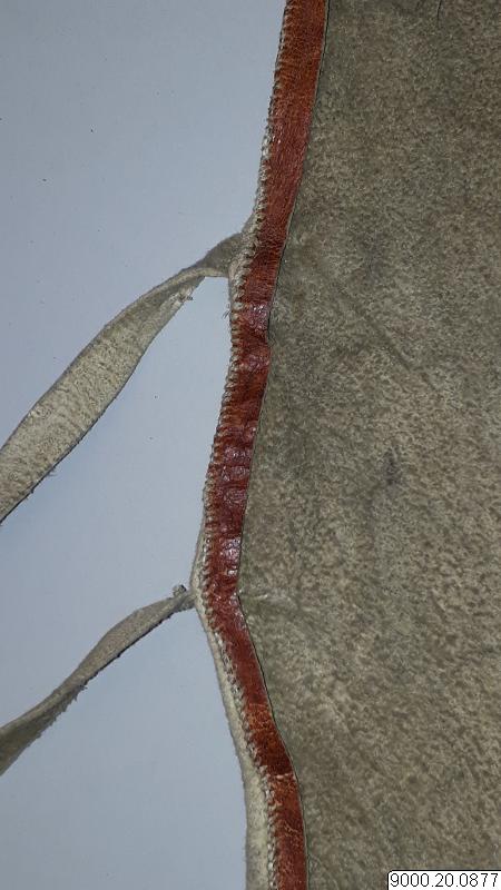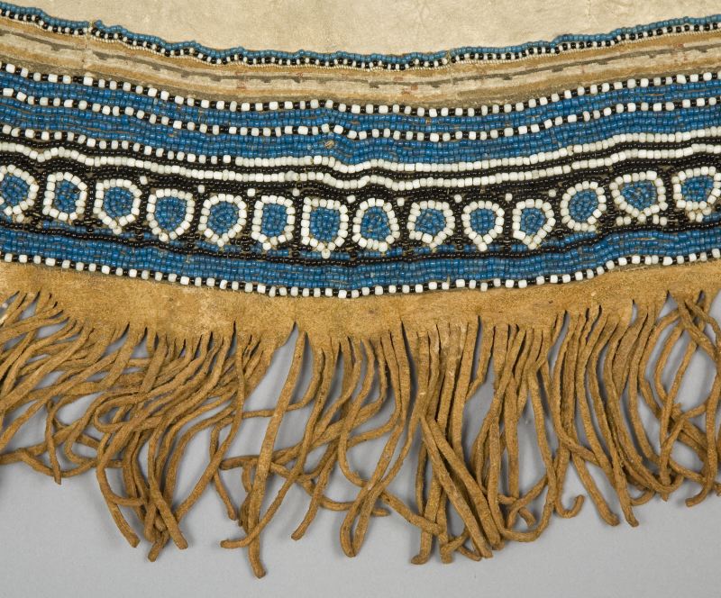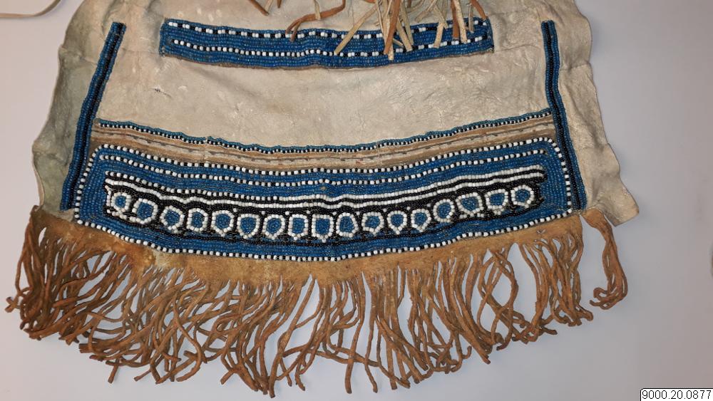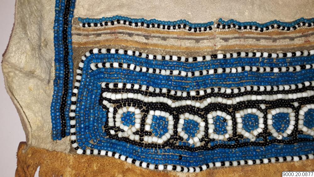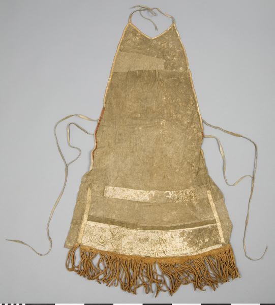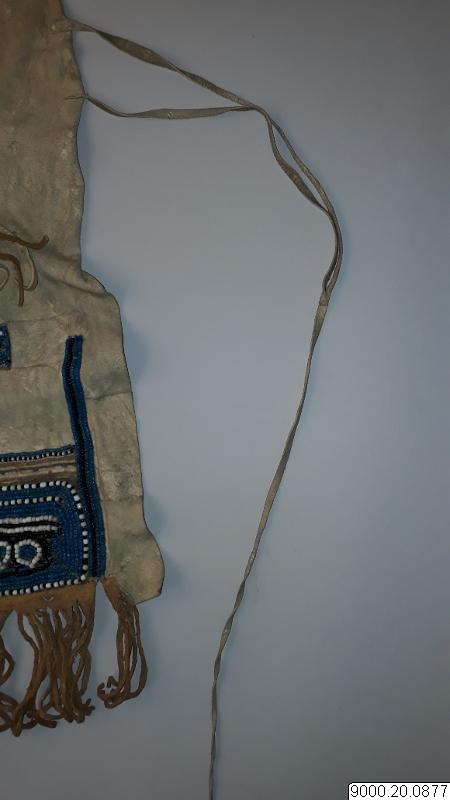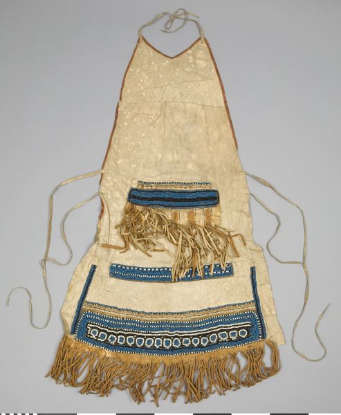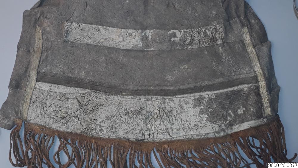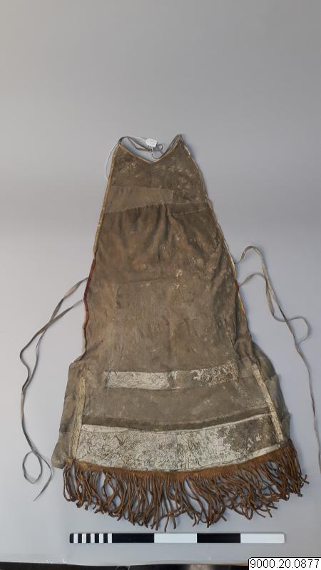 Skört eller förkläde/framkläde av skinn med dekor framtill resp nertill längs nederkant; av blå, svarta resp. blåa, svarta och vita glaspärlor, i senare fallet i cirkelformer; röd vita broderier av sentråd eller piggsvinstaggar; samt skinnfransar i nederkant på båda ställena. Skinnet även bemålat och delvis broderat på delar av ovan nämnda partier. Kantad i övrehälften samt runt halsrundning av br...