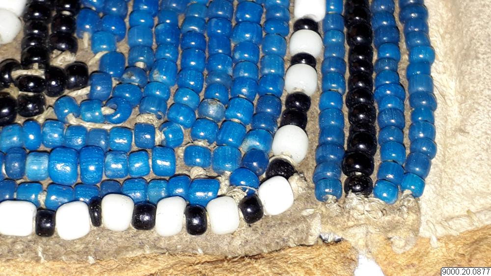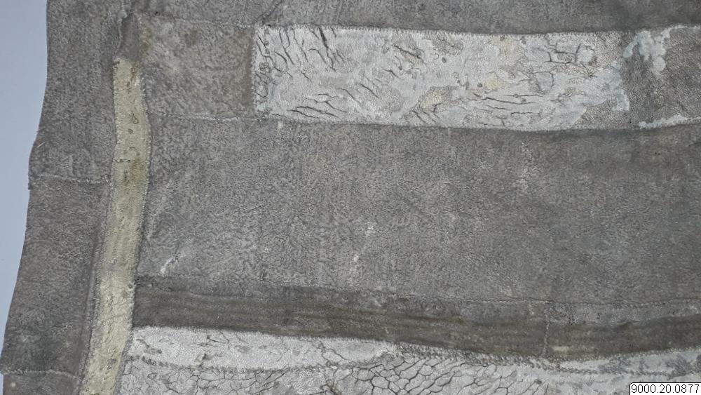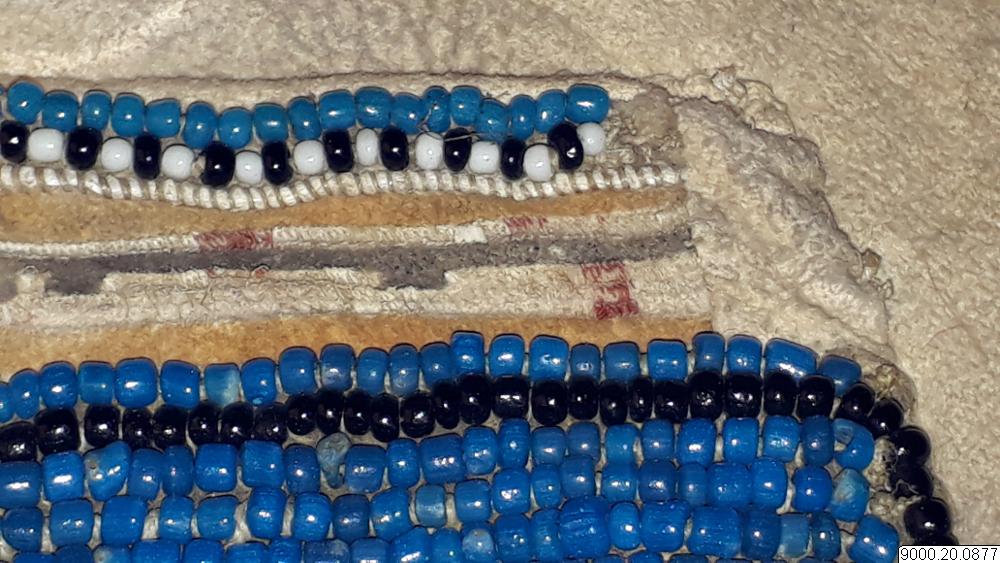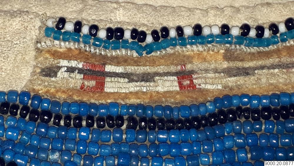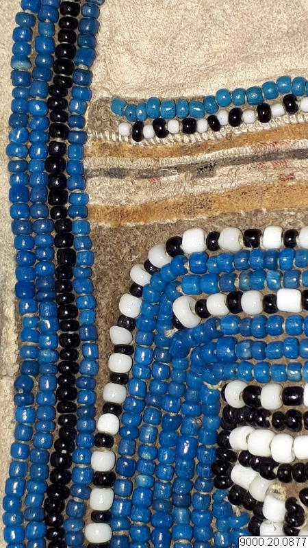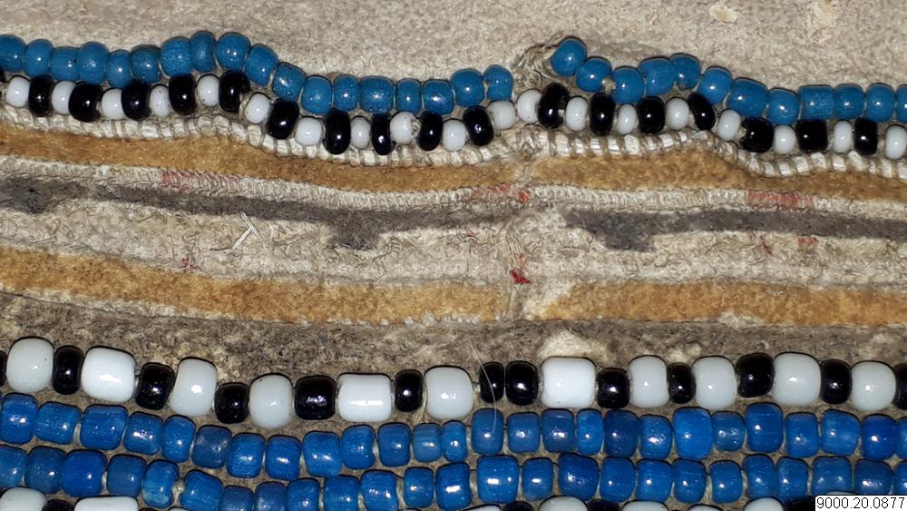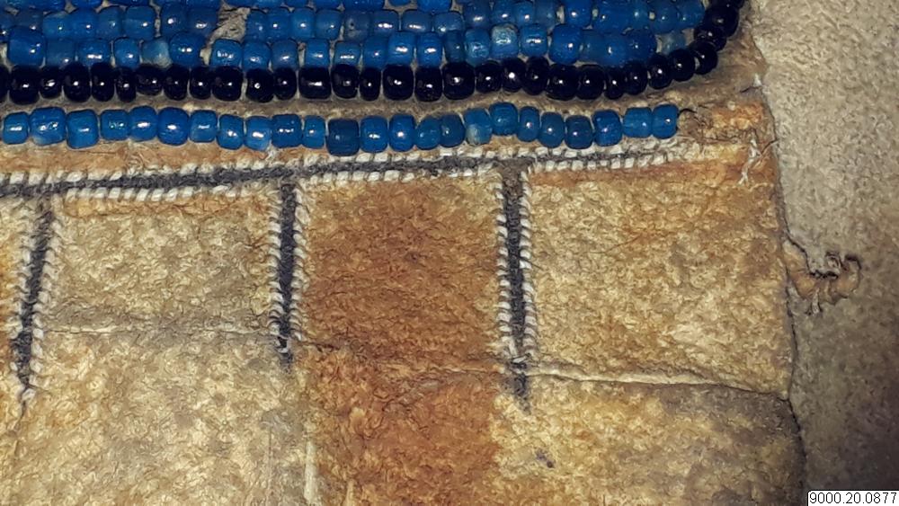 Skört eller förkläde/framkläde av skinn med dekor framtill resp nertill längs nederkant; av blå, svarta resp. blåa, svarta och vita glaspärlor, i senare fallet i cirkelformer; röd vita broderier av sentråd eller piggsvinstaggar; samt skinnfransar i nederkant på båda ställena. Skinnet även bemålat och delvis broderat på delar av ovan nämnda partier. Kantad i övrehälften samt runt halsrundning av br...
