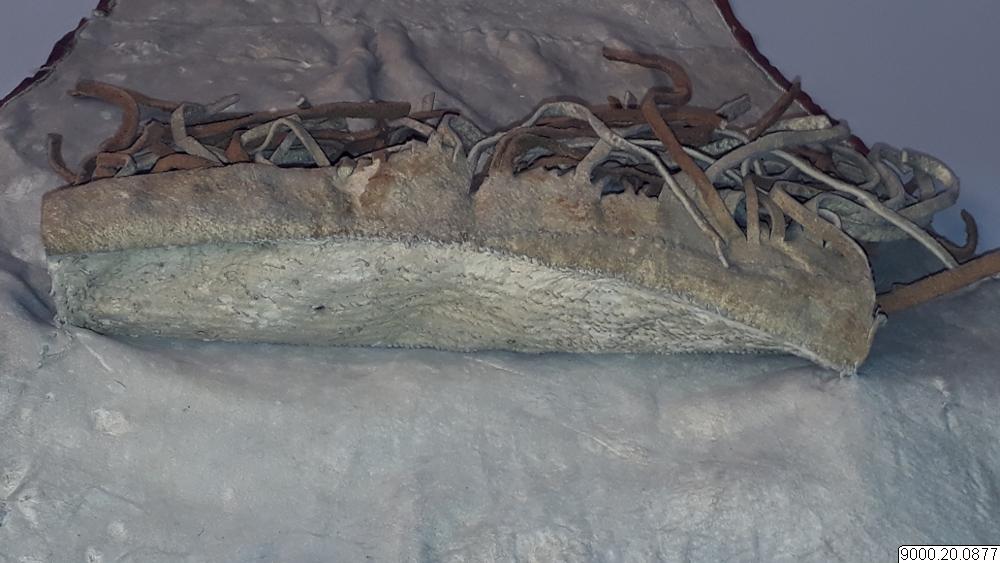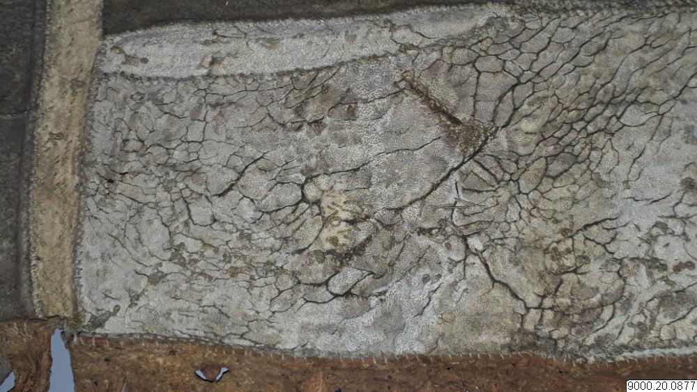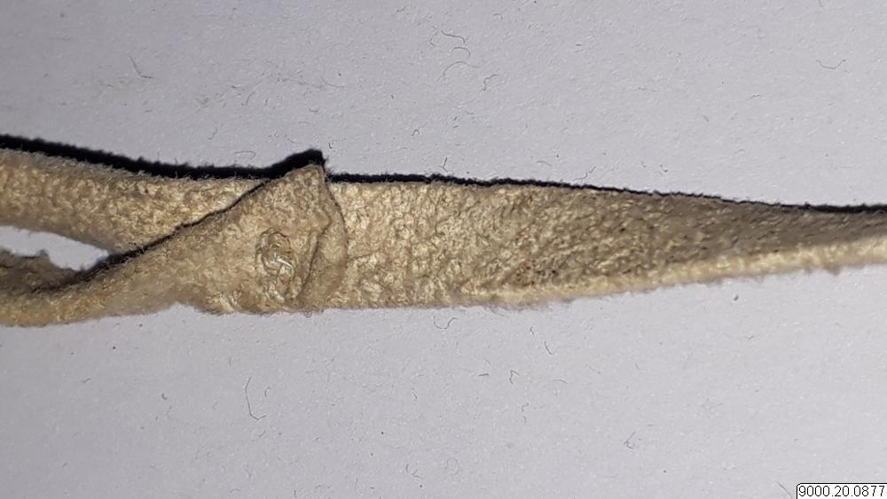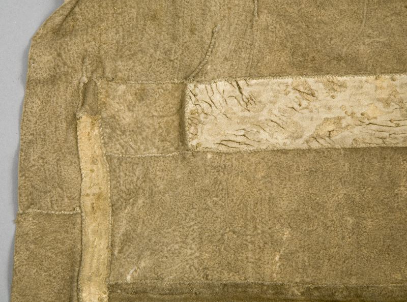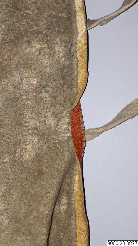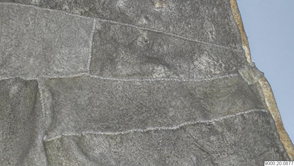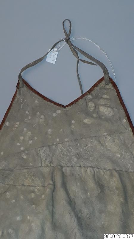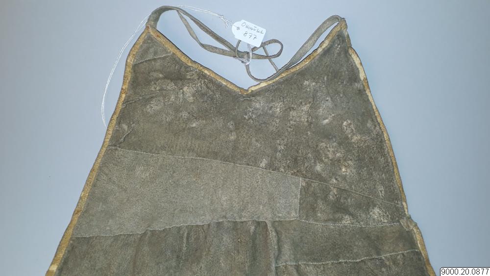 Skört eller förkläde/framkläde av skinn med dekor framtill resp nertill längs nederkant; av blå, svarta resp. blåa, svarta och vita glaspärlor, i senare fallet i cirkelformer; röd vita broderier av sentråd eller piggsvinstaggar; samt skinnfransar i nederkant på båda ställena. Skinnet även bemålat och delvis broderat på delar av ovan nämnda partier. Kantad i övrehälften samt runt halsrundning av brun skinnremsa. Knytband av skinnremsor i båda sidor vid hals samt två på var sida i midjan. (se även omärkt 823 (stövlar) o 878 (jacka))