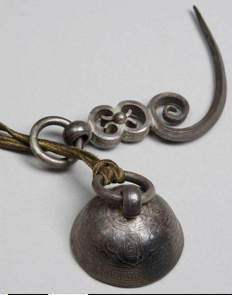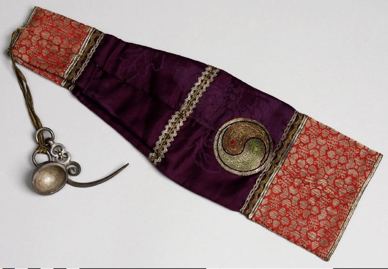 Tobakspung(?) av purpurlila sidendamast och gul/röda mönstervävda tyger i överkant och botten. Dekorerad med broderat runt ¿jingjang¿-tecken och med påsydda snörmakeriband. Gulmetallsnodd som knytband med metallskål och -krok längst ut. Fodrad med rostbrunt tuskaftvävt bomullsfoder.