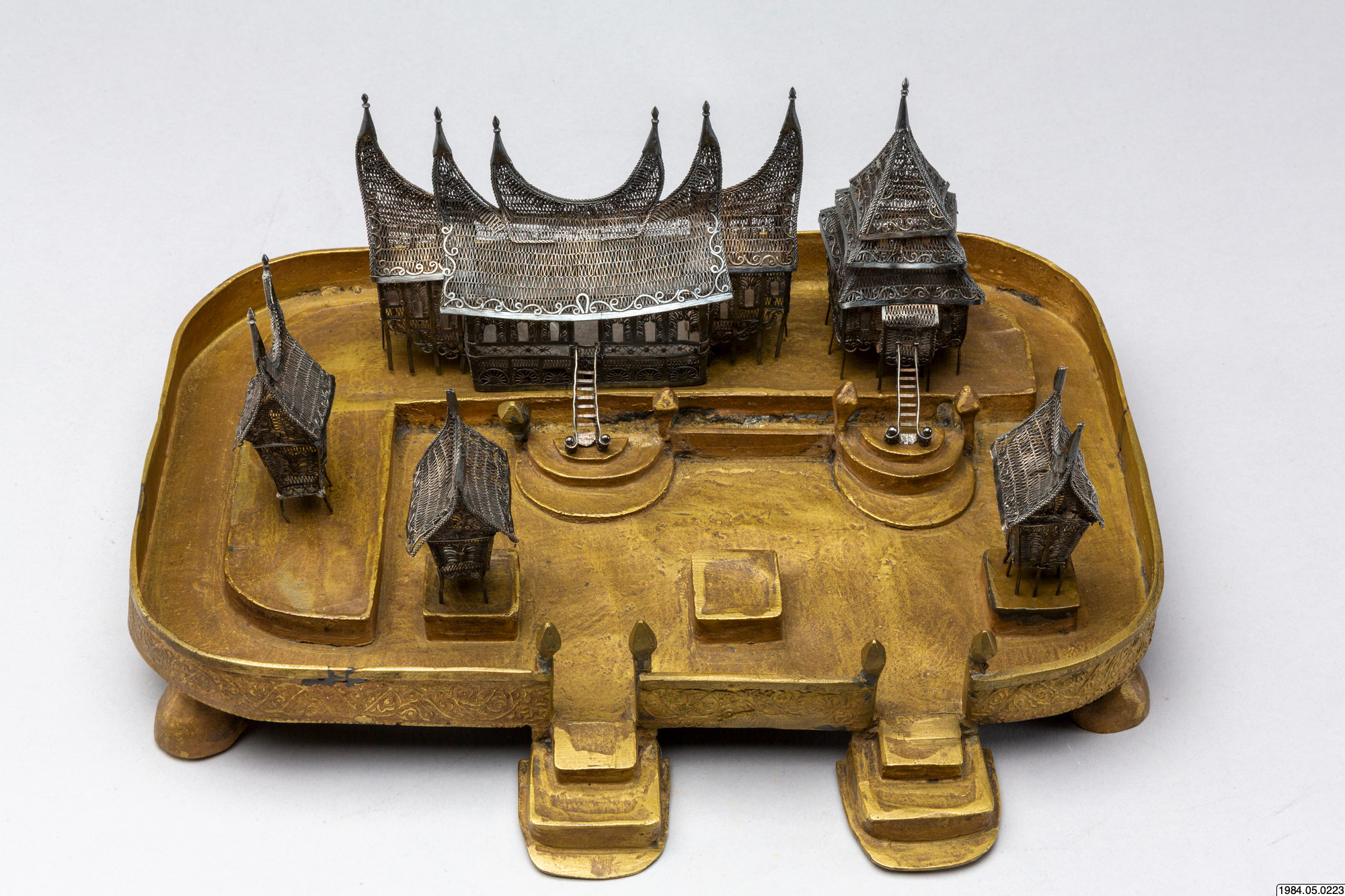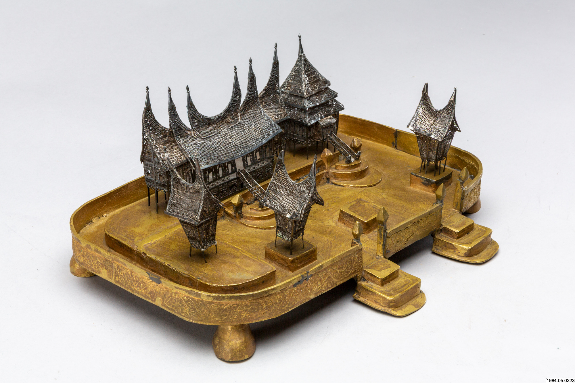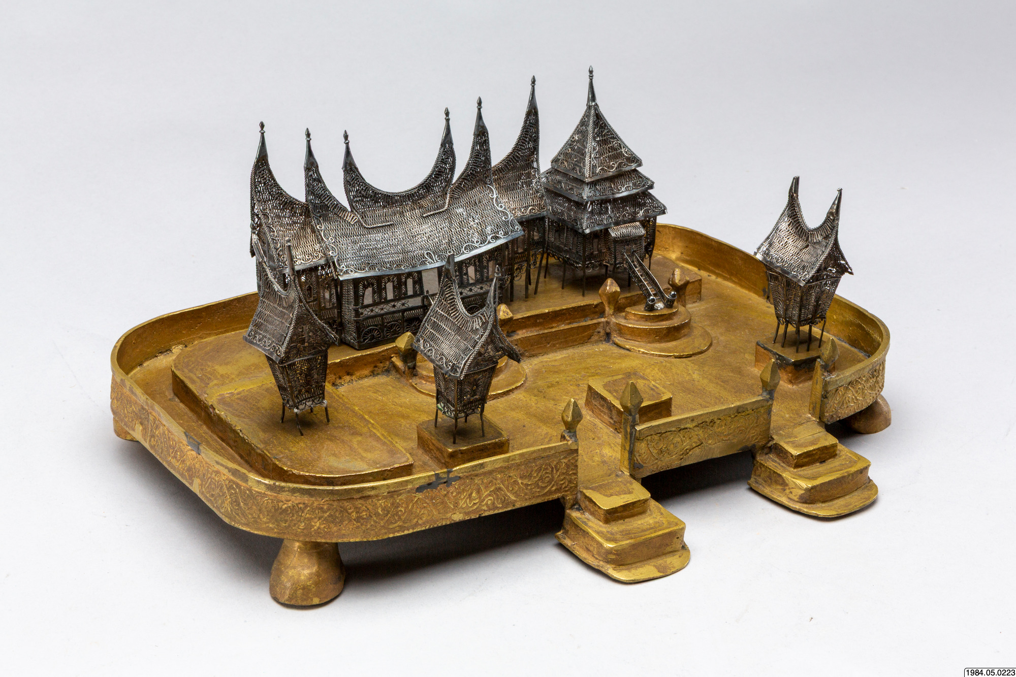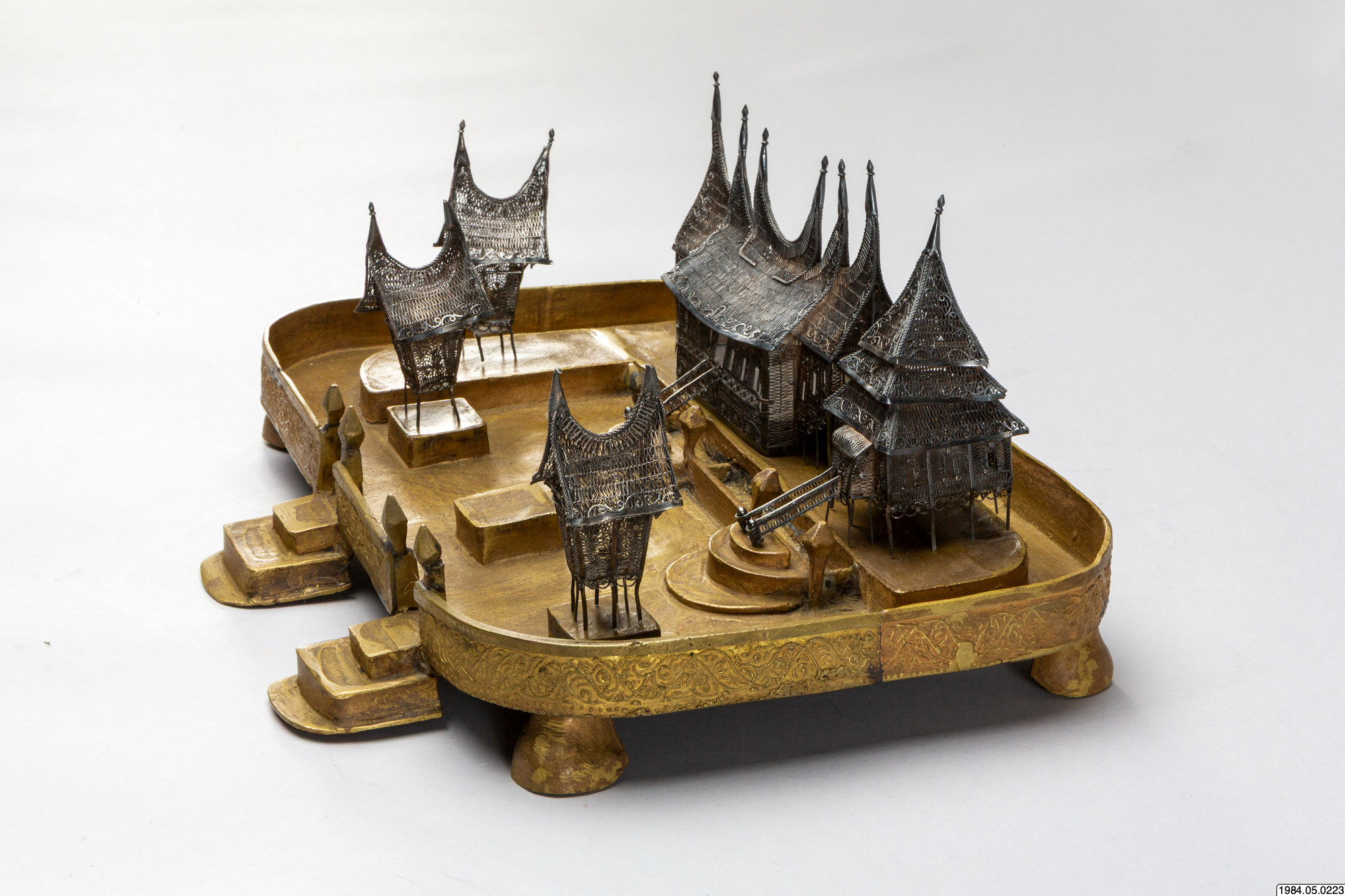 • Husmodeller av silver, filigransarbete, med tillhörande sockel.