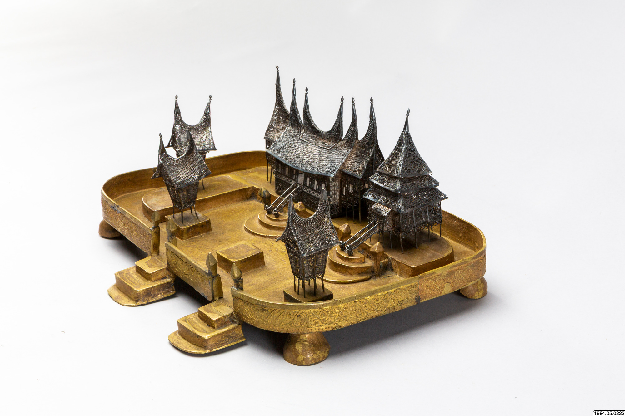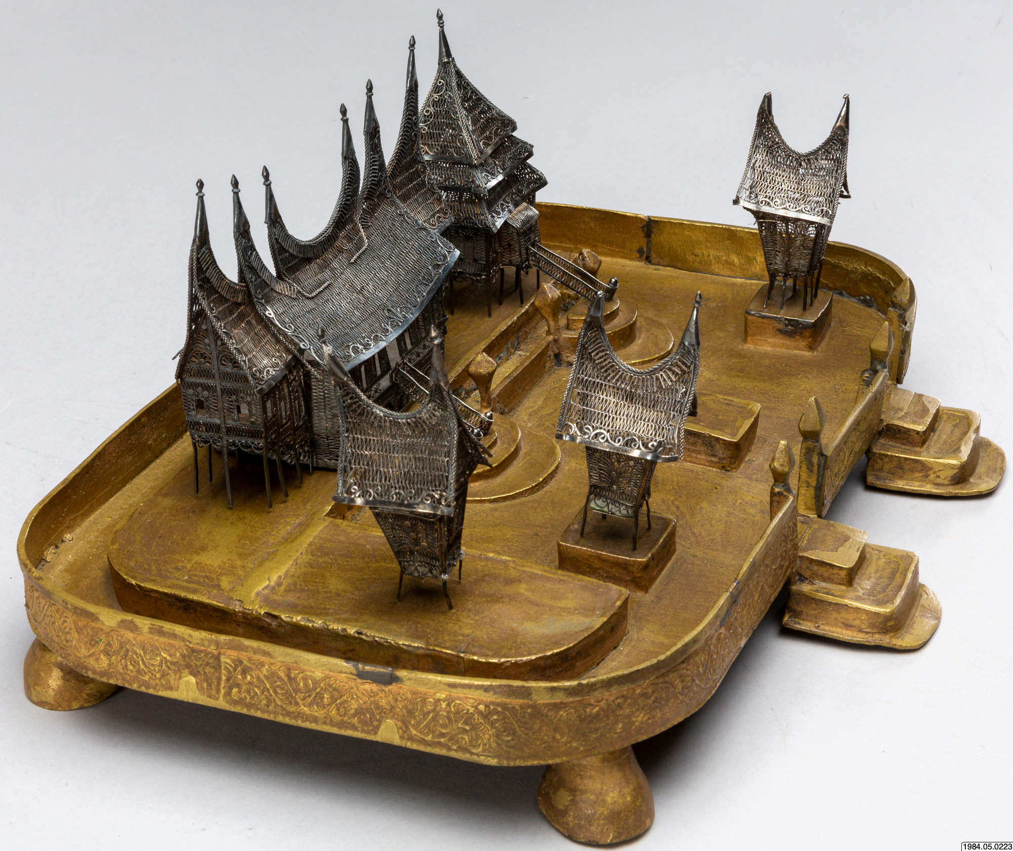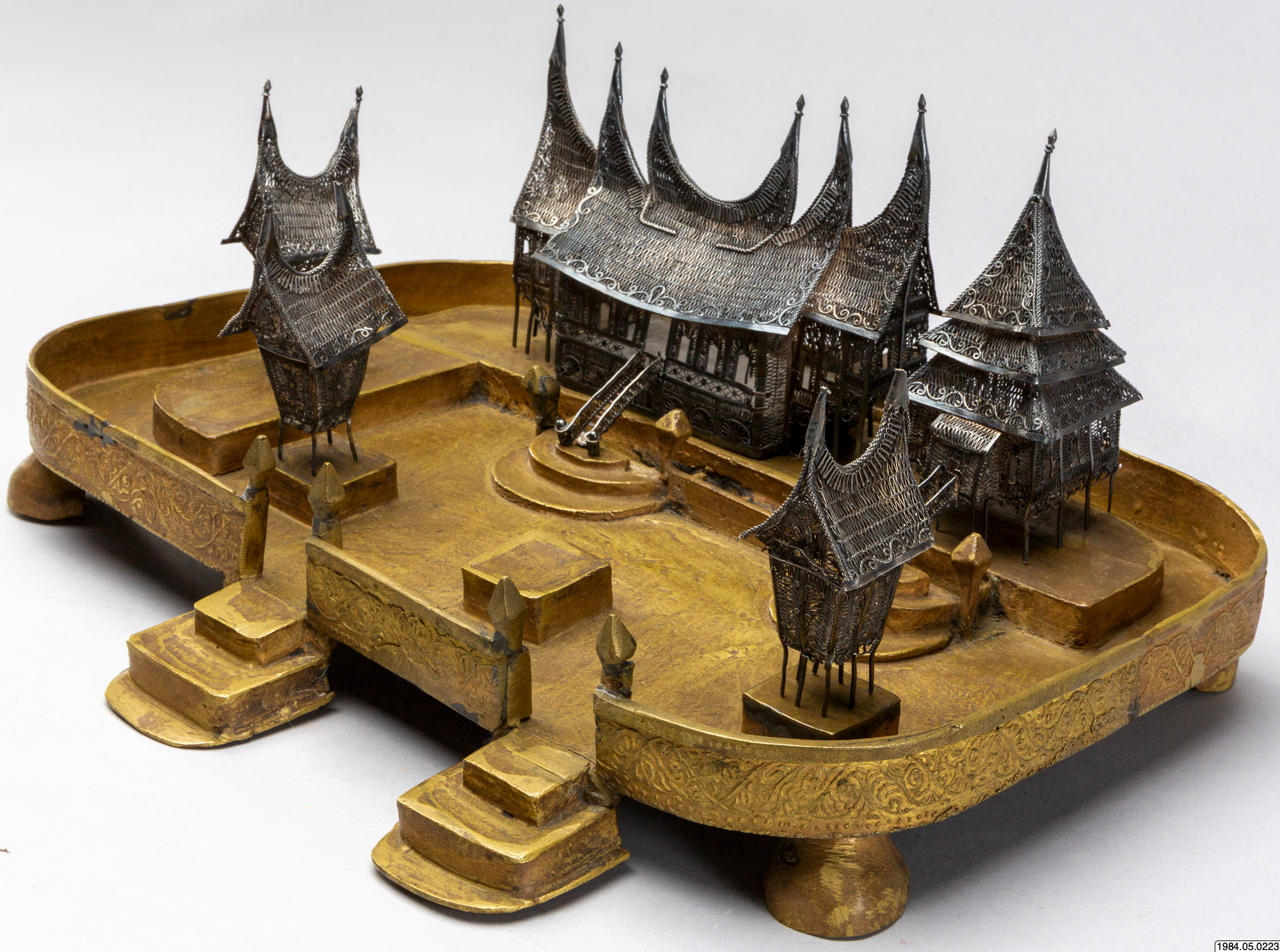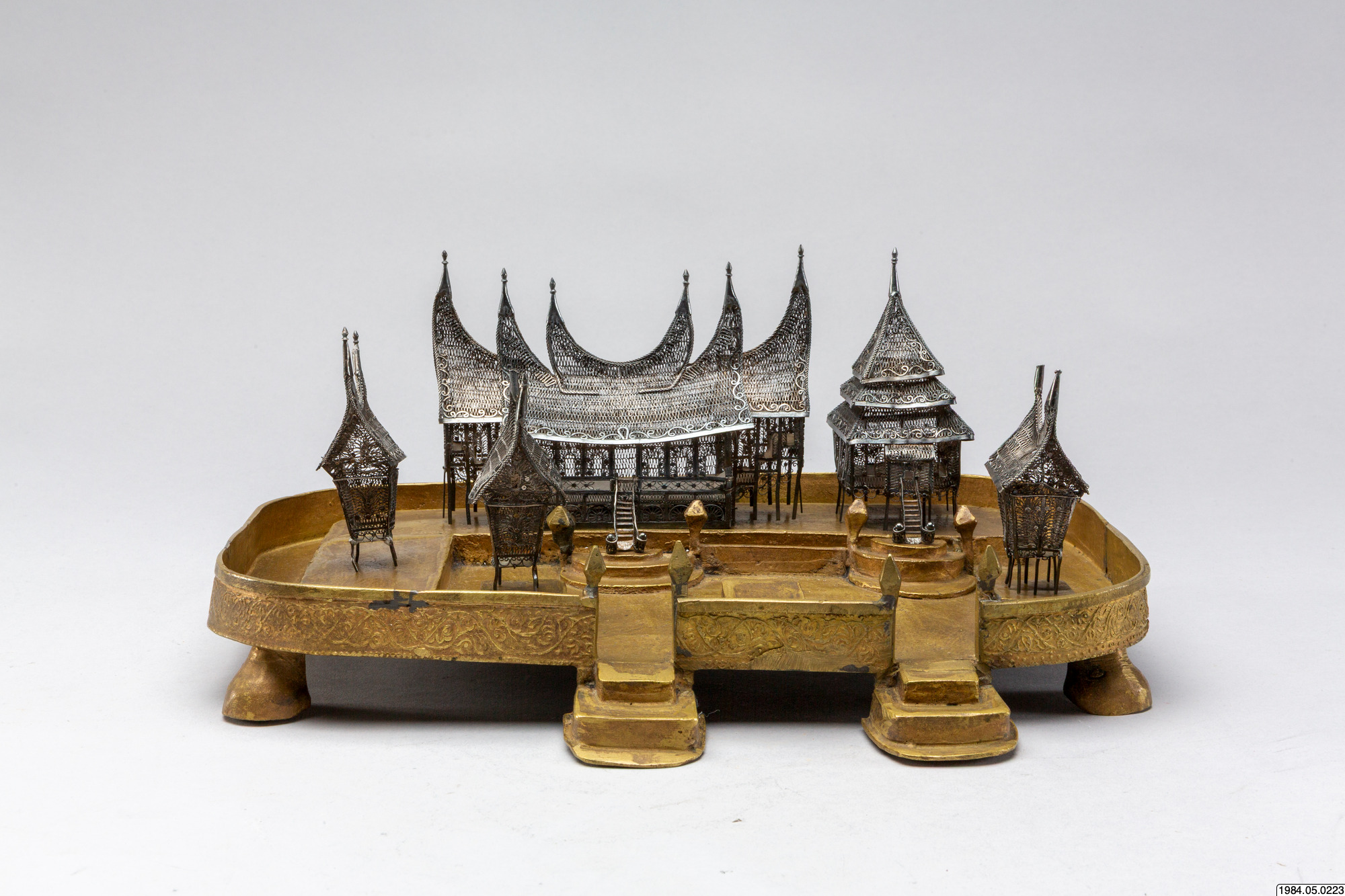 • Husmodeller av silver, filigransarbete, med tillhörande sockel.
