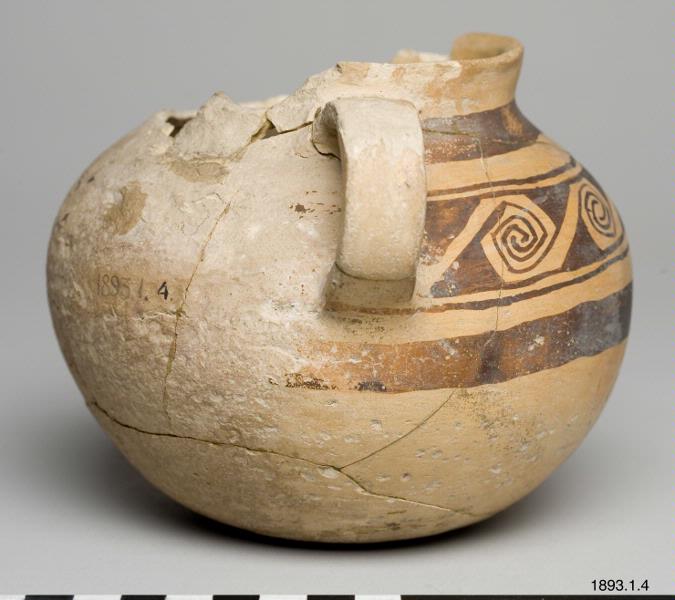 Handled bowl with whirlwind spirals. (generalkatalogen) Black/orange pitcher. Hopi. Awatovi Black-on-yellow. 1300-1350 (1325-1375). From Awatóvi site. (Enligt Kelley Hays-Gilpin, forskarbesök februari 2009).