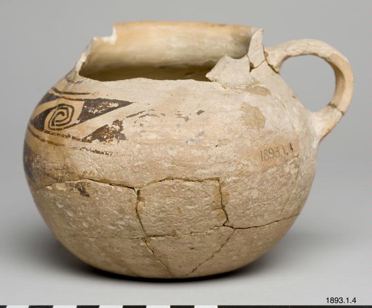 Gul lerskål med handtag, svarta orneringar, vilvelvind spiral,. (ark.). Ruinen vid A-wa-to-bi. (generalkatalogen) Black/orange pitcher. Hopi. Awatovi Black-on-yellow. 1300-1350 (1325-1375). From Awat...