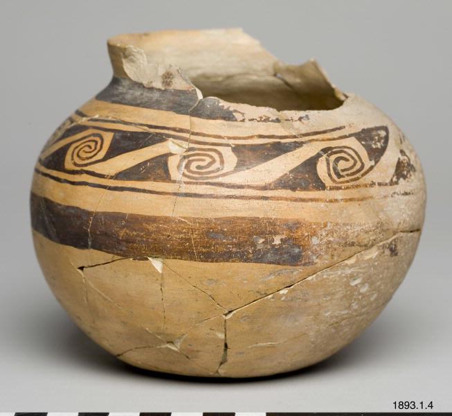 Handled bowl with whirlwind spirals. (generalkatalogen) Black/orange pitcher. Hopi. Awatovi Black-on-yellow. 1300-1350 (1325-1375). From Awatóvi site. (Enligt Kelley Hays-Gilpin, forskarbesök februa...