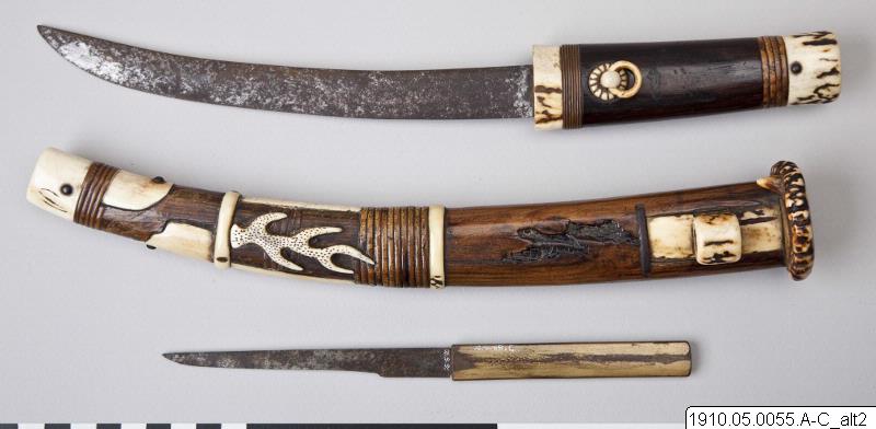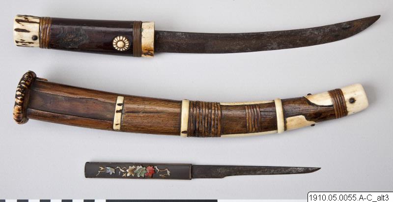 • Daimiosvärd med slida. Fäste och slida äro rikt ornerade genom omvirad och infälld rotting men framför allt genom rika inläggningar av elfenben. På framsidan av slidan den vanliga lilla harakirikniven. Dess skaft är på sidorna och baksidan guldlackerat, på framsidan företer den, mot en mörk matt bakgrund, (forts.) en vinlövsranka i upphöjt arbete/utförd i guldlack, rött och grönt lack samt, vad de... Visa hela
