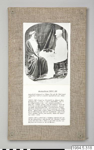 Tavla; fotografi monterat på en träbit i en ram av grå textil. Motiv: två män som delar en kanna te. Enligt tillhörande text: "Slavhandlaren Tippu-Tip. Autentiskt fotografi av Tippu-Tip och Dr Wolf taget i Zanzibar 1894 av svenske ingenjören S.E. Allgurén. Tippu-Tip (=ljudet av ett bösskott) eg. Hamed Ben Muhammed, (*1850, + 1905 i Zanzibar), var en beryktad arabisk slav- och elfenbenshandlare. Ha...