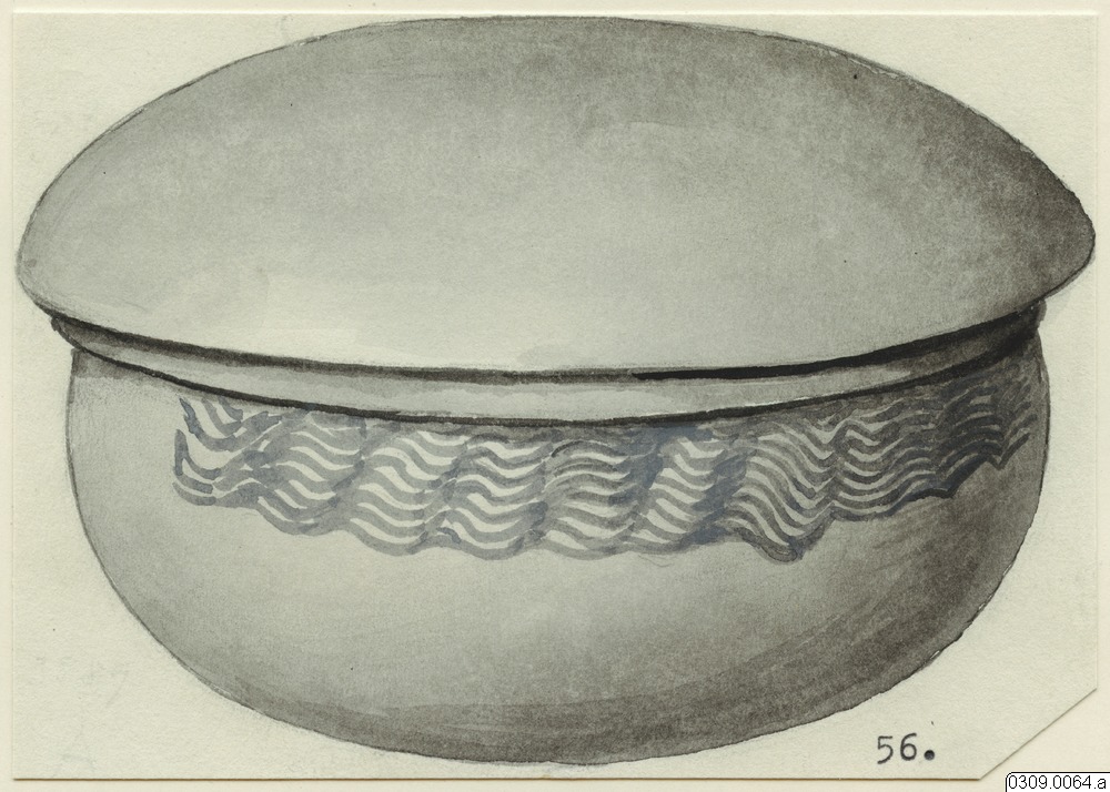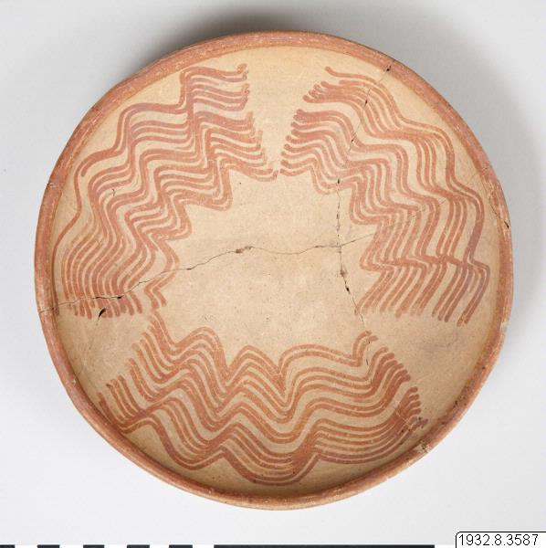 Lerskål. Mazapan-typ. Dekorerad med tre horisontella våglinjegrupper. (generalkatalogen) Anträffades "högst upp" stjälpt över 3589 tillsammans med 3588.