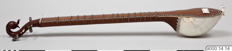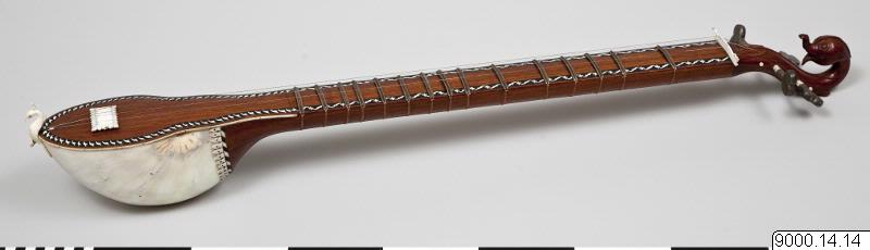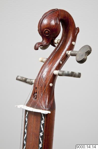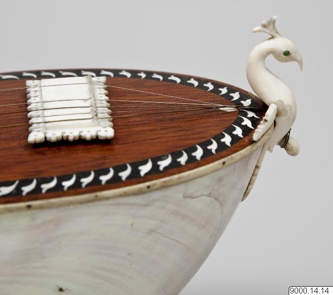 • Ett mycket vackert stränginstrument. Resonansbotten gjort av en snäcka, översidan är täckt av trä, dekorerad med beninläggningar. Stallen gjorda av dekorerade snidade benbitar. Den långa halsen (greppbrädan) är likaså dekorerad med beninläggningar längs båda kanterna och slutar i ett snidat djurhuvud. Hjärtformiga stämskruvar i metall. (AU)