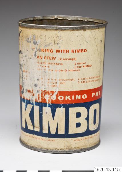 Burkar som har innehållit motorolja eller matfett används allmänt som ölbägare. De säljs på marknaden i staden Eldoret. Matfett av märket KIMBO används allmänt i Marakwet och man hamrar ner kanten på den tomma Kimbo-burken och använde den sedan som mugg. Plåtmuggarna är moderna och praktiska är inte lika värdefulla, man kan tappa dem och fixa en ny. W. Östbergs texter.