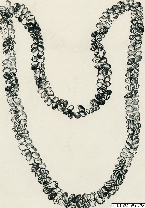 • Halsband av små vita, gula och brunrandiga snäckor i växlande gruppering.