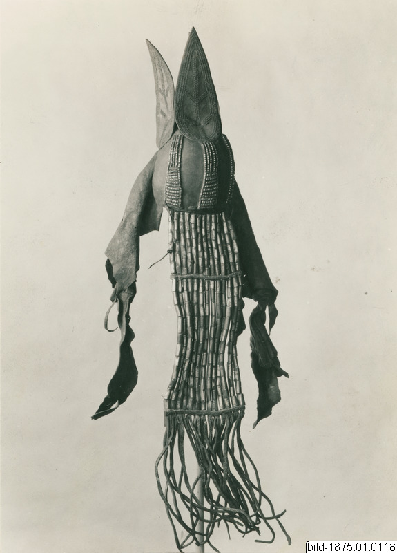 • Huvudbonad av läder med 3 uppstående öronliknande flikar och långar hängande läderremmar prydda med hoprullade bitar av järnbleck. Bäres av gift kvinna. (Generalkatalogen)