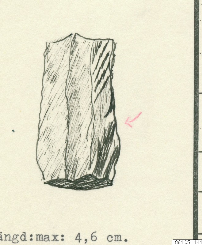Av grå bergart. Båda ändarna avslutas av en tvär brottyta, varigenom spånet fått en närmast rektangulär form, Längd max. 4,6 em, Bredd max. 2,8 cm. [ocr]