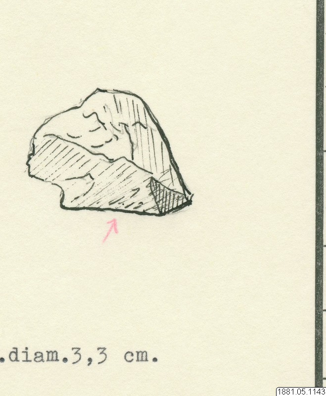• Av grå bergart. Närmast triangulär form. Max.diam. 3,3 cm. Ukänd fyndort [ocr]