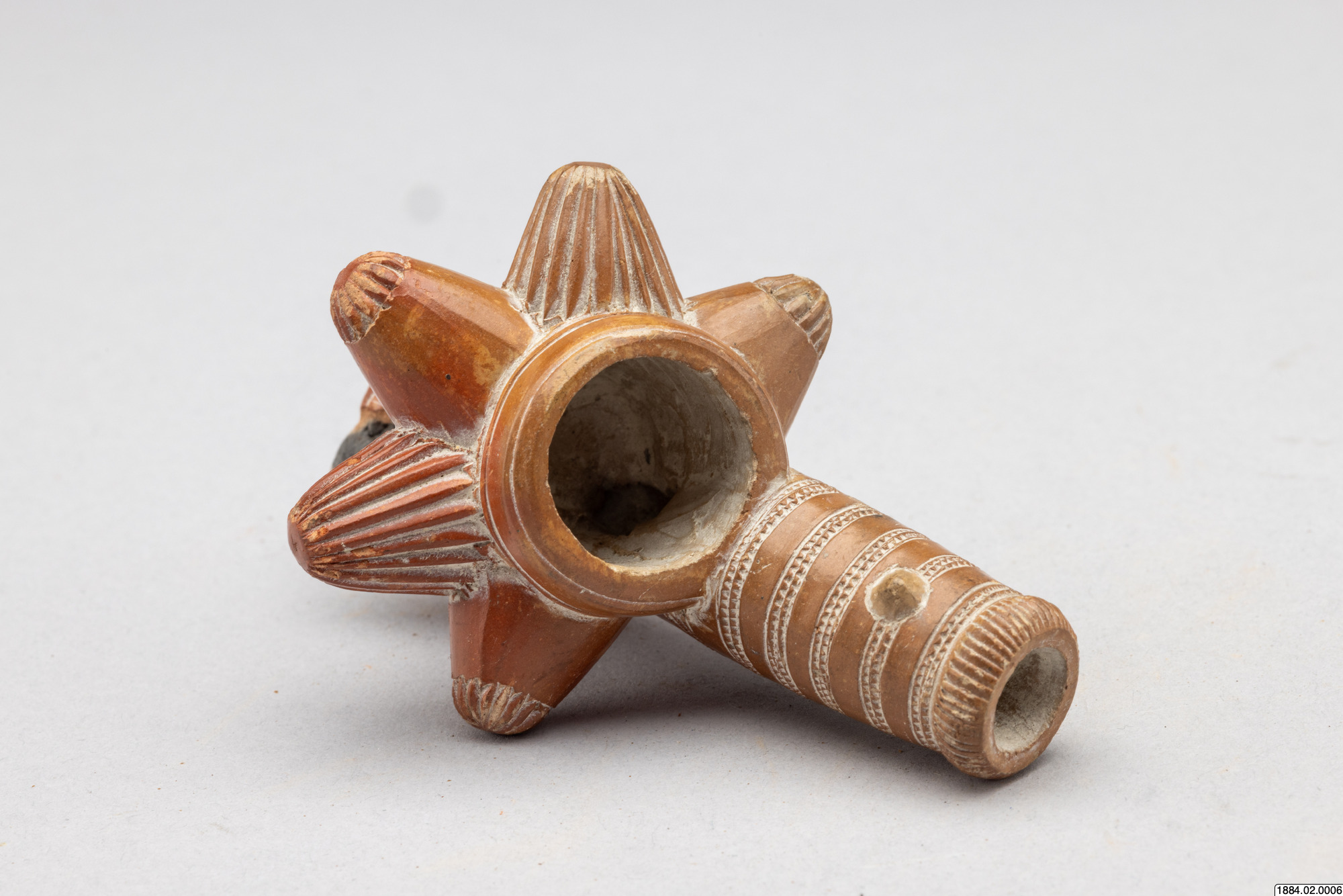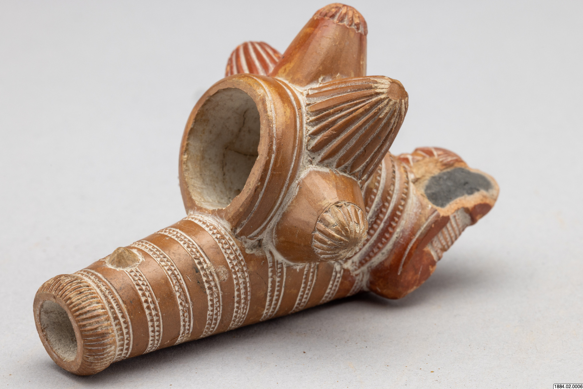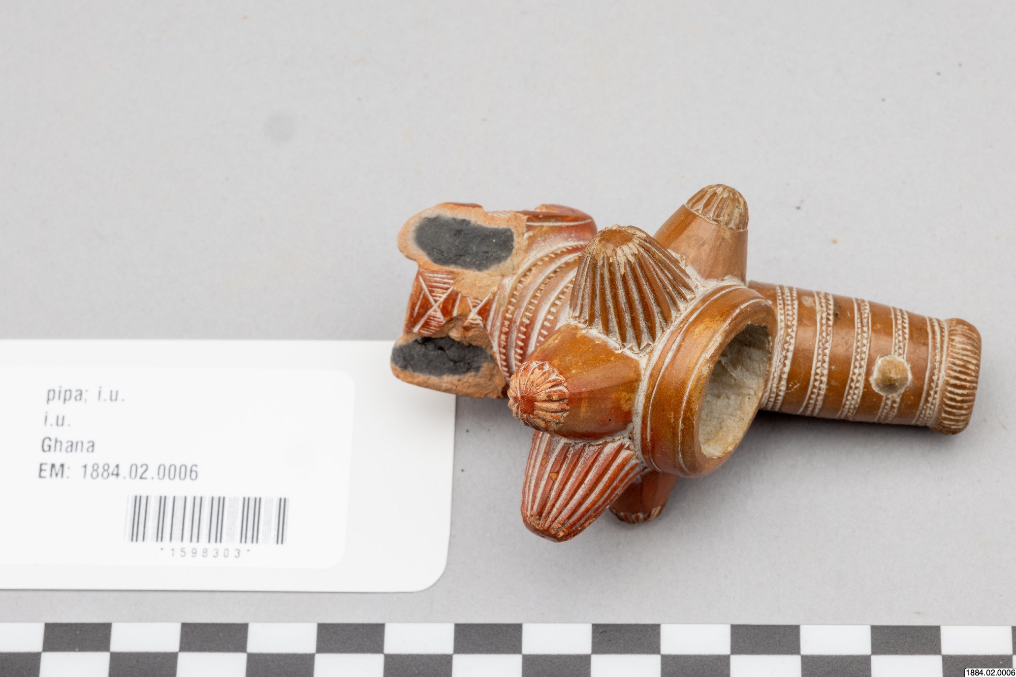 Huvudet av röd lera, prytt med inristade ornament fyllda med vit färg. Kring piphuvudets mynning fem horisontalt utgående snidade taggar. Skaft av mörkt trä. Skaftets längd: 32,6 cm. Huvudets längd: 8,7 cm. Huvudets diam. 2,1 cm. Ashanti [ocr]