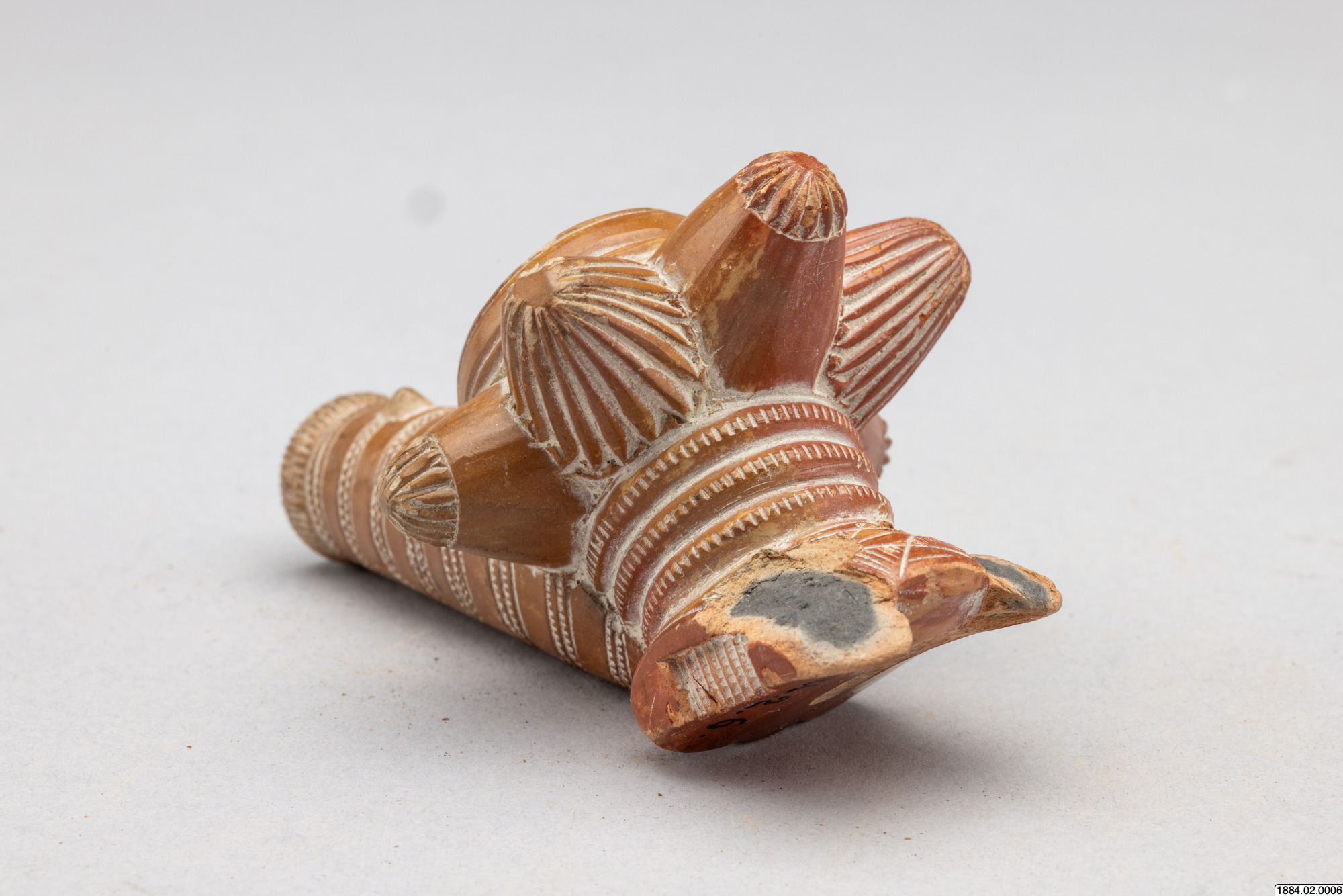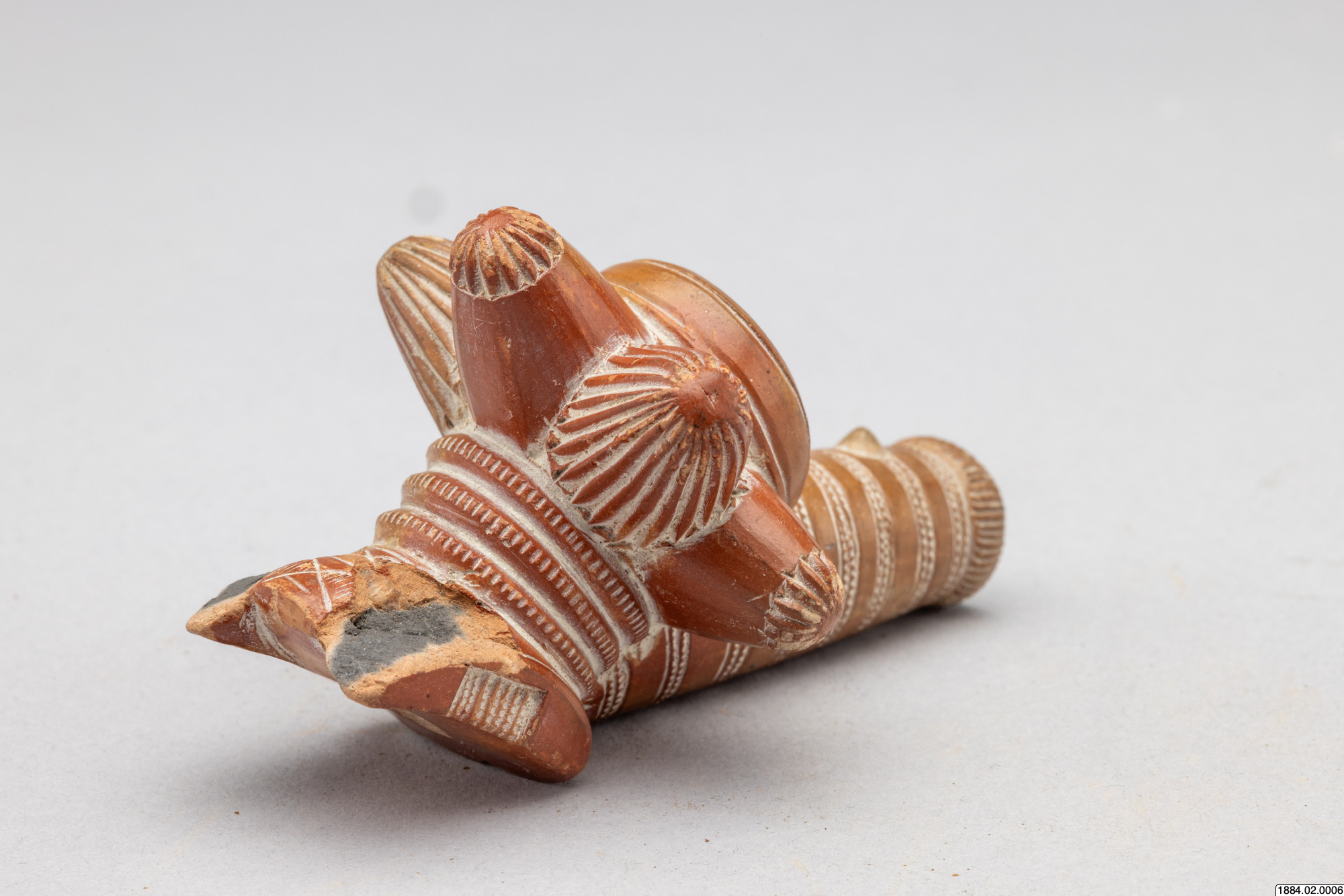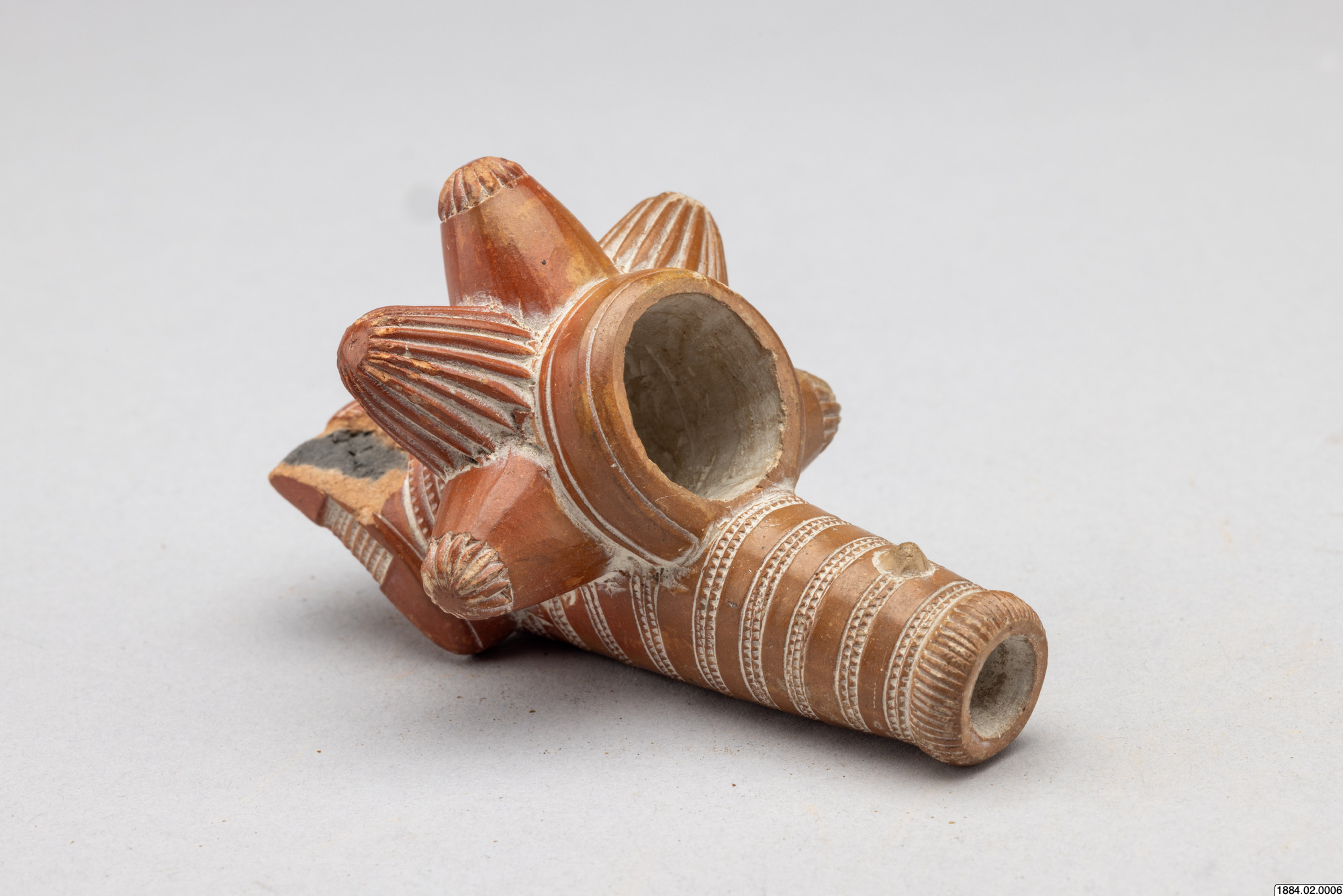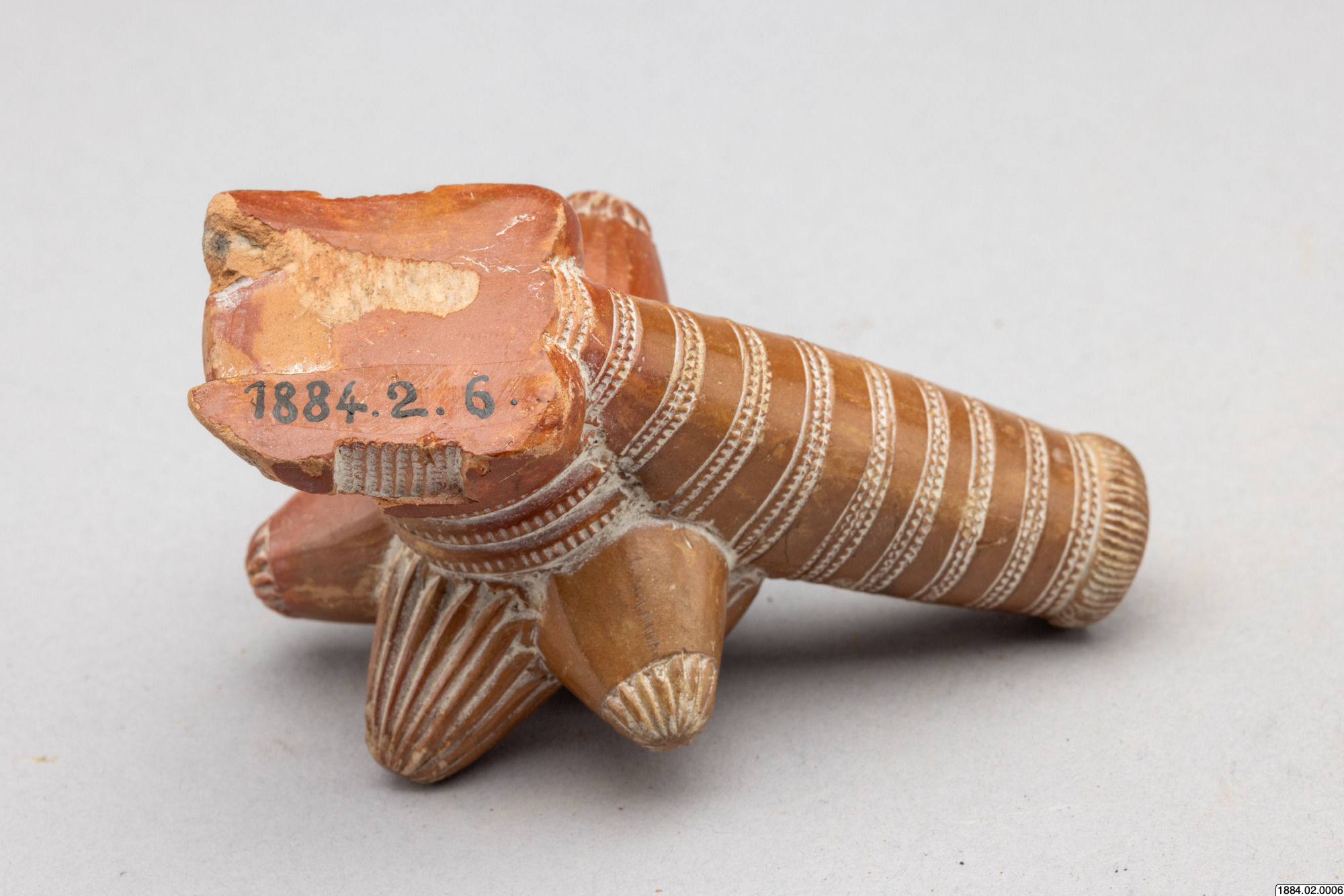 Huvudet av röd lera, prytt med inristade ornament fyllda med vit färg. Kring piphuvudets mynning fem horisontalt utgående snidade taggar. Skaft av mörkt trä. Skaftets längd: 32,6 cm. Huvudets längd: 8,7 cm. Huvudets diam. 2,1 cm. Ashanti [ocr]
