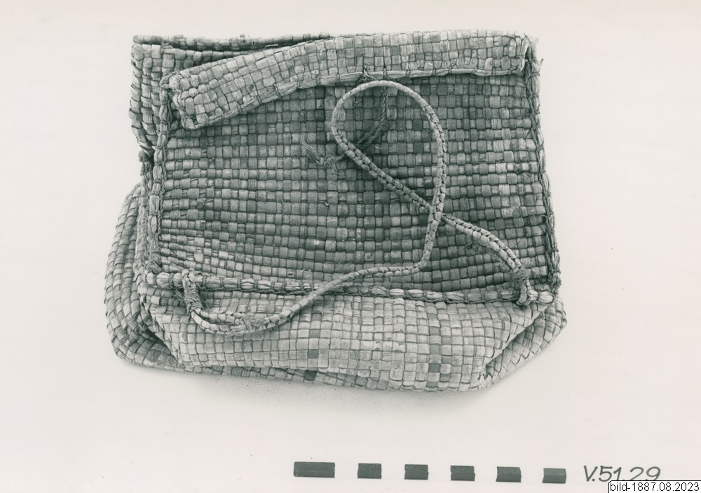 Korg med fickor för förvaring av tobak, prylar, nålar, en kniv av musselskal till skärning,av pandanusblad. (Orig.kat. nr. V.51. 29). Marshallöarna Jaluit [ocr]
