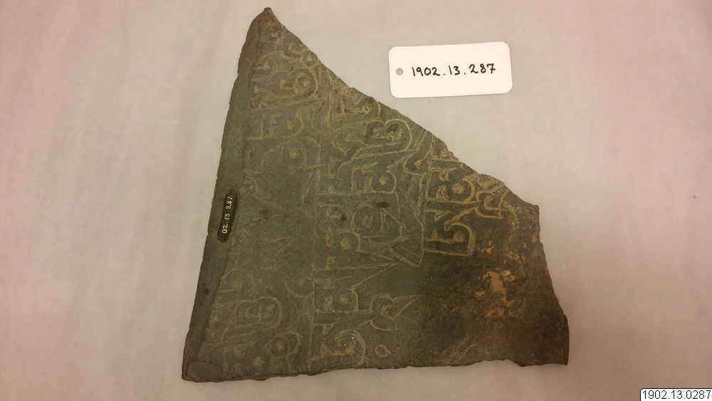 • Stentavla i skiffer med inhuggen relief, tibetansk skrift.