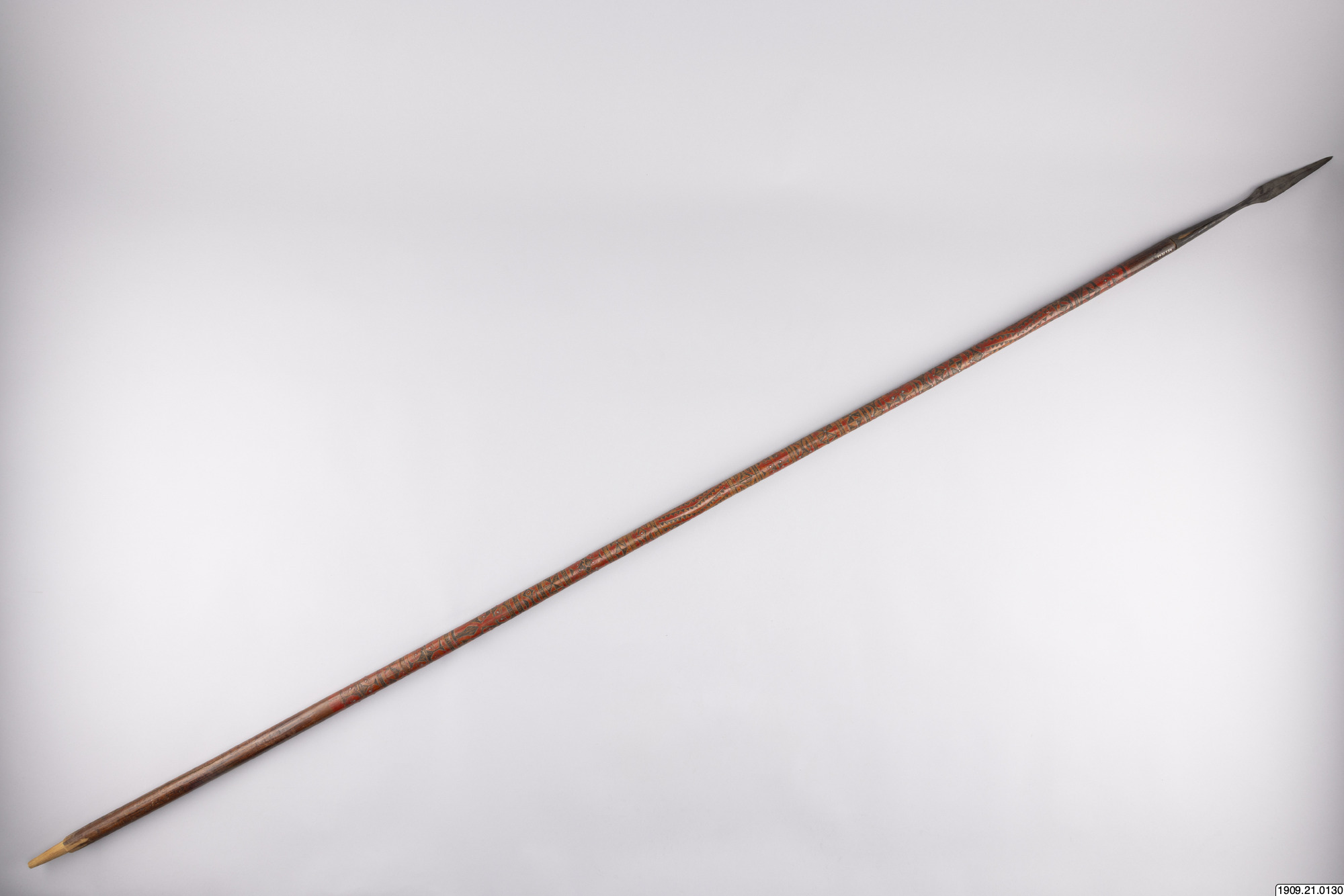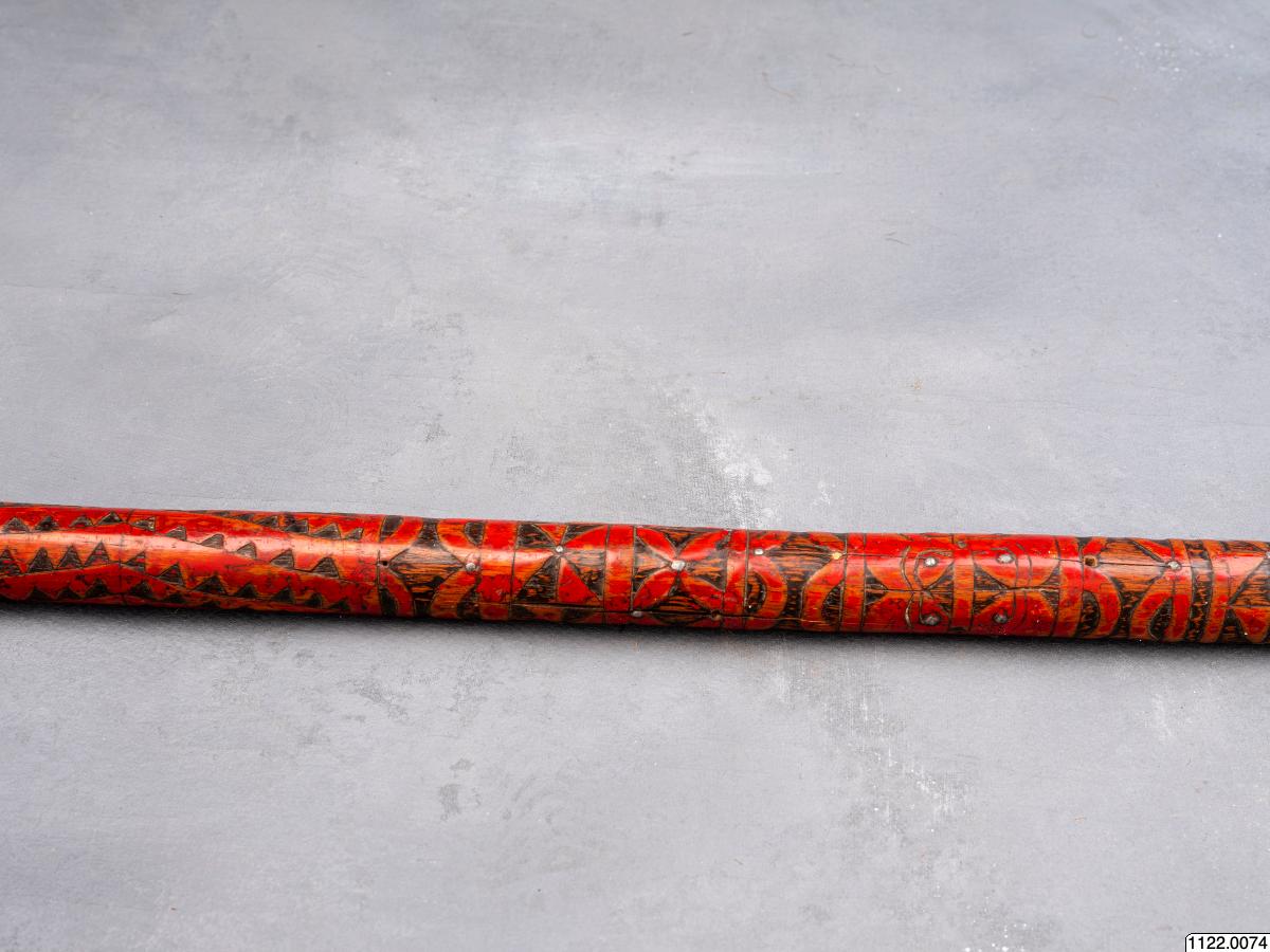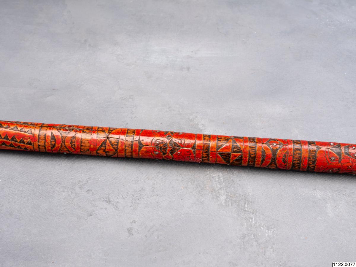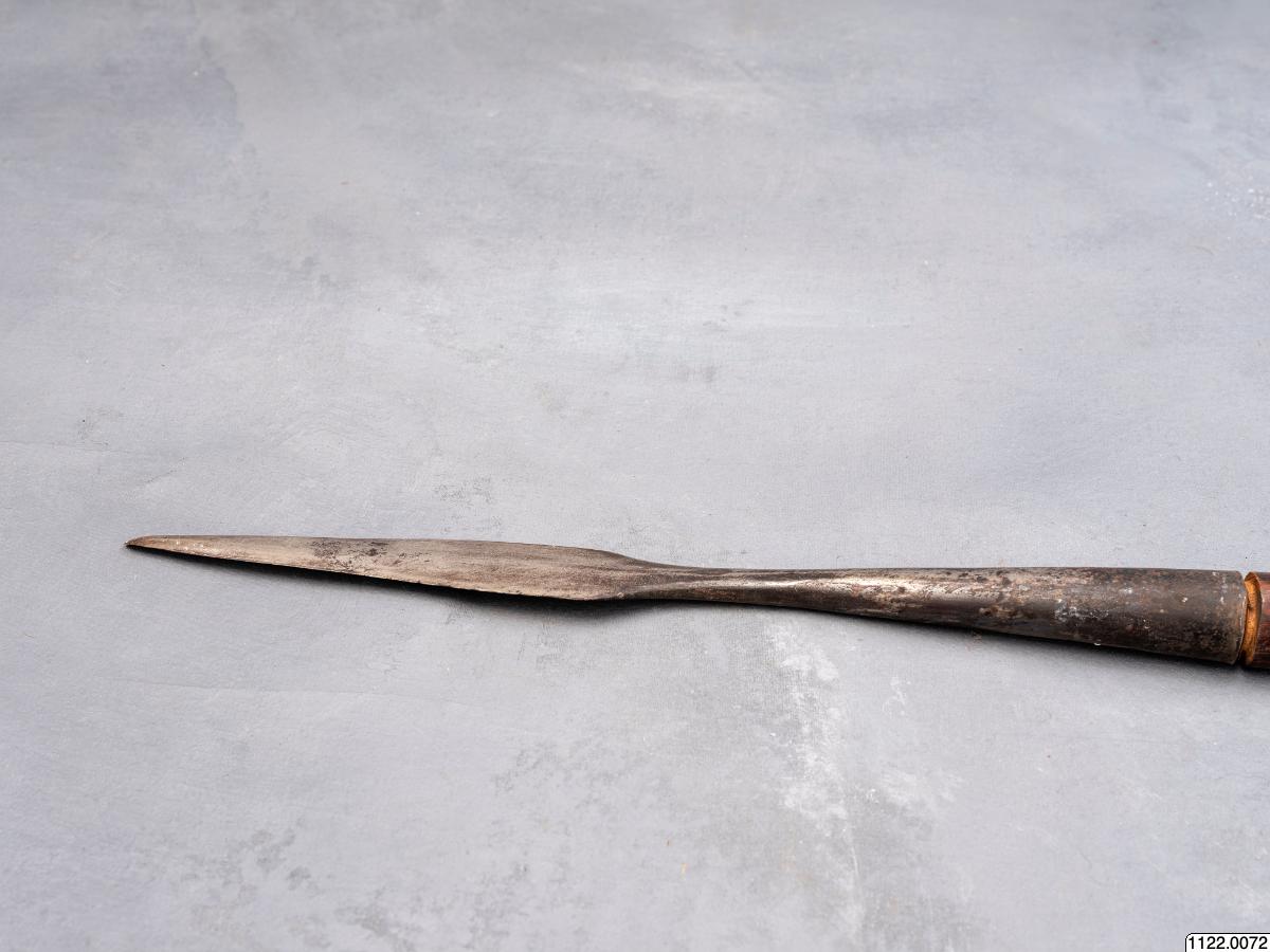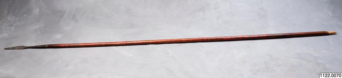 • Lans. Klinga av järn, skaft av rödmålat trä, prytt med rika sniderier och beslaget med järnstift (generalkatalog).