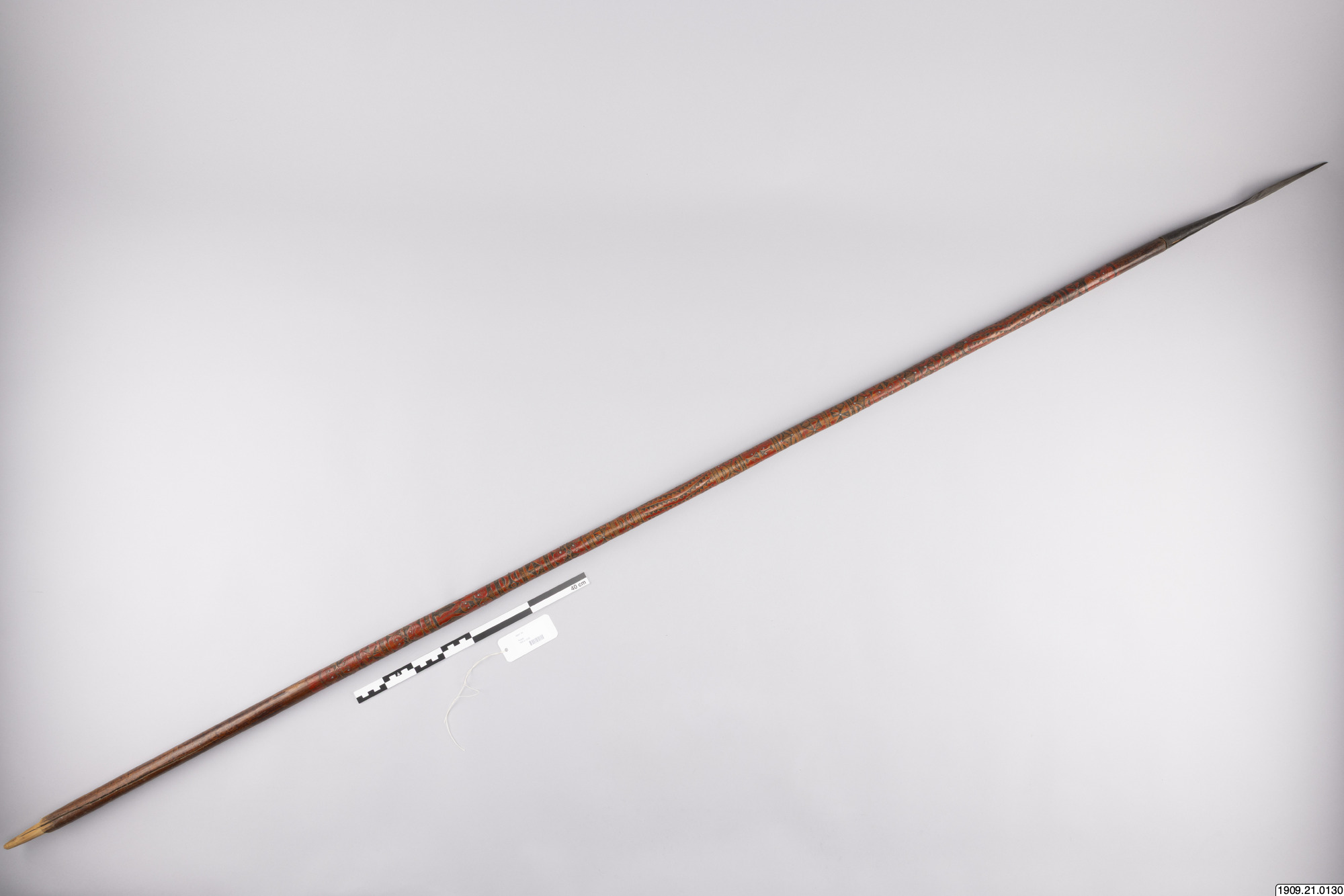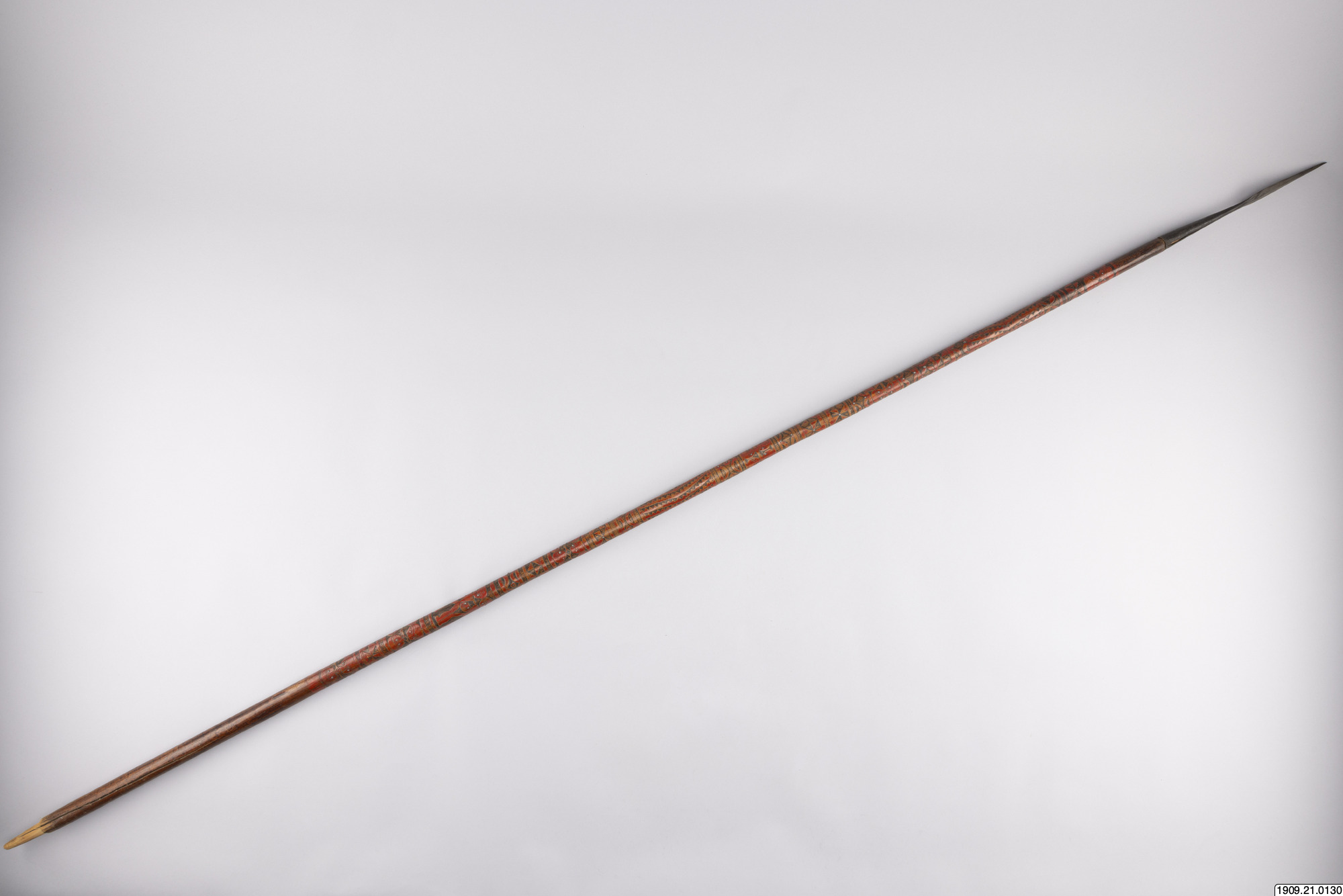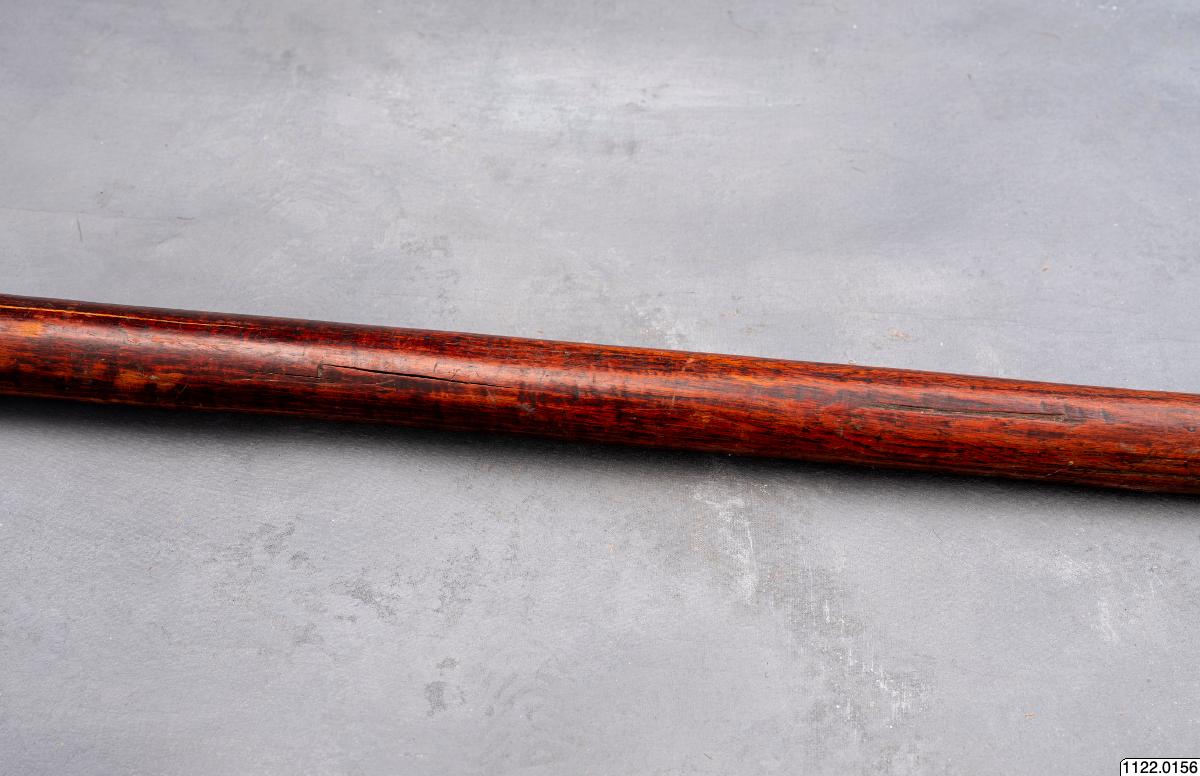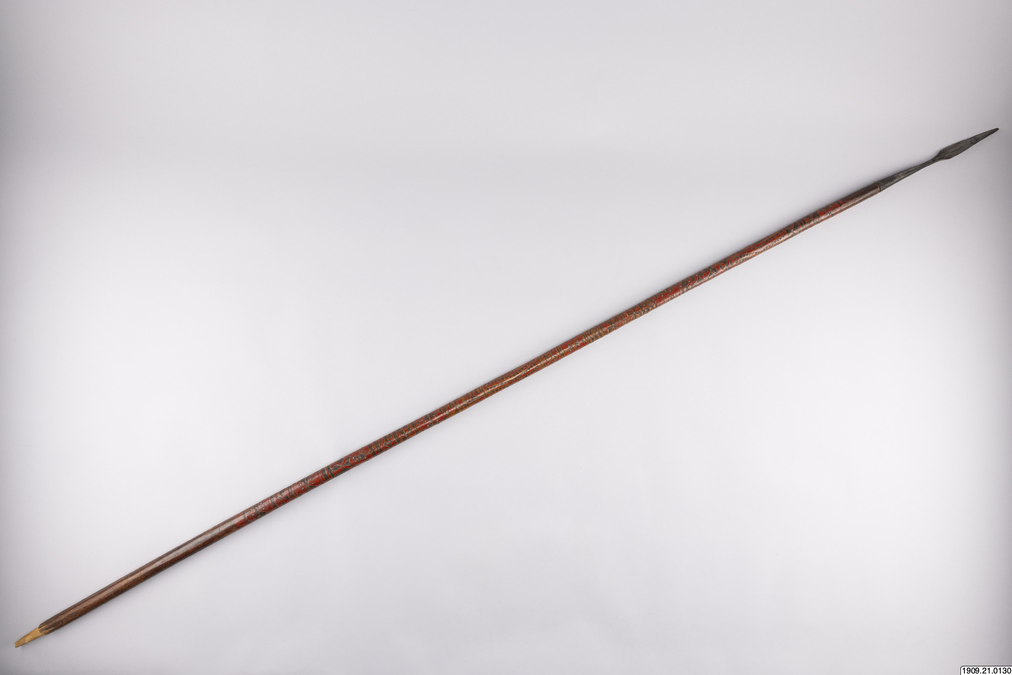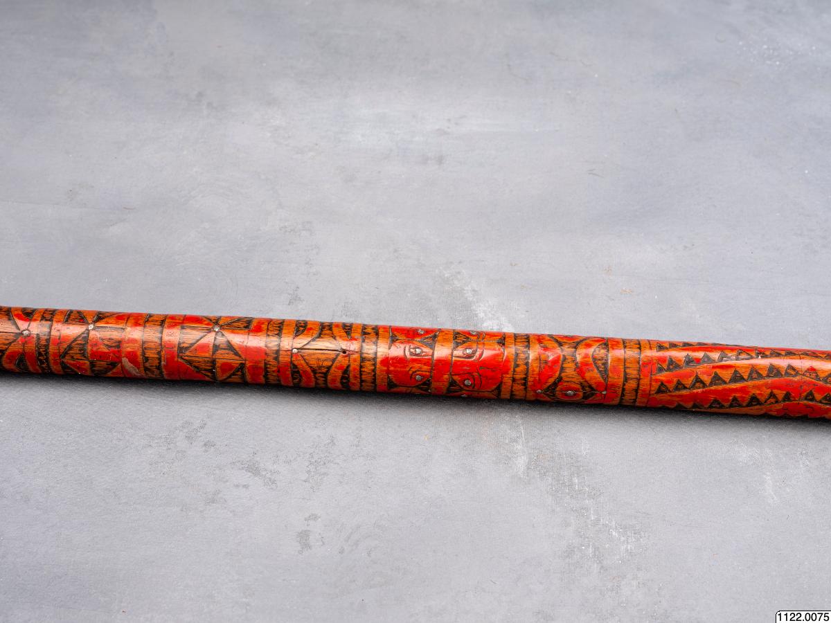 • Lans. Klinga av järn, skaft av rödmålat trä, prytt med rika sniderier och beslaget med järnstift (generalkatalog).