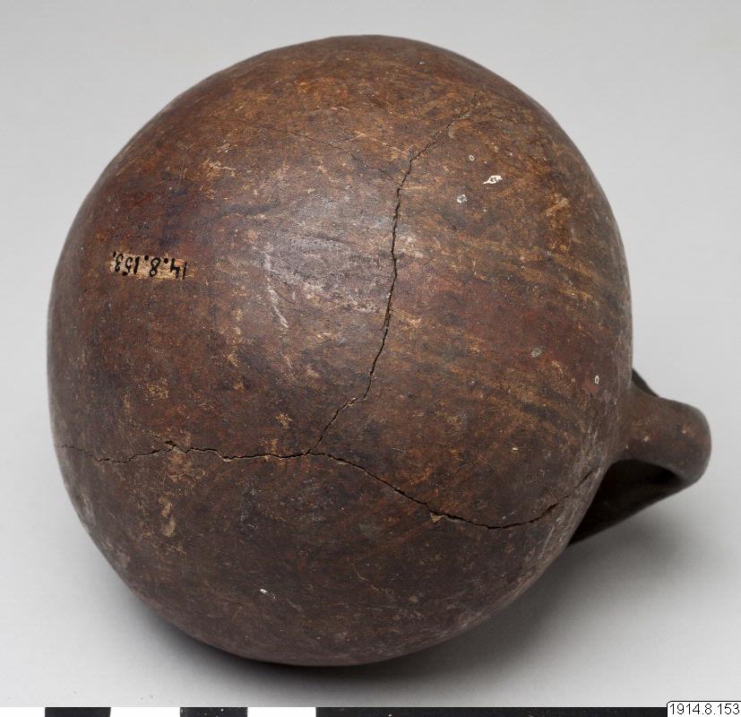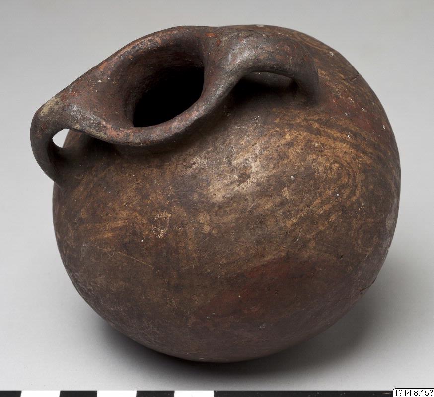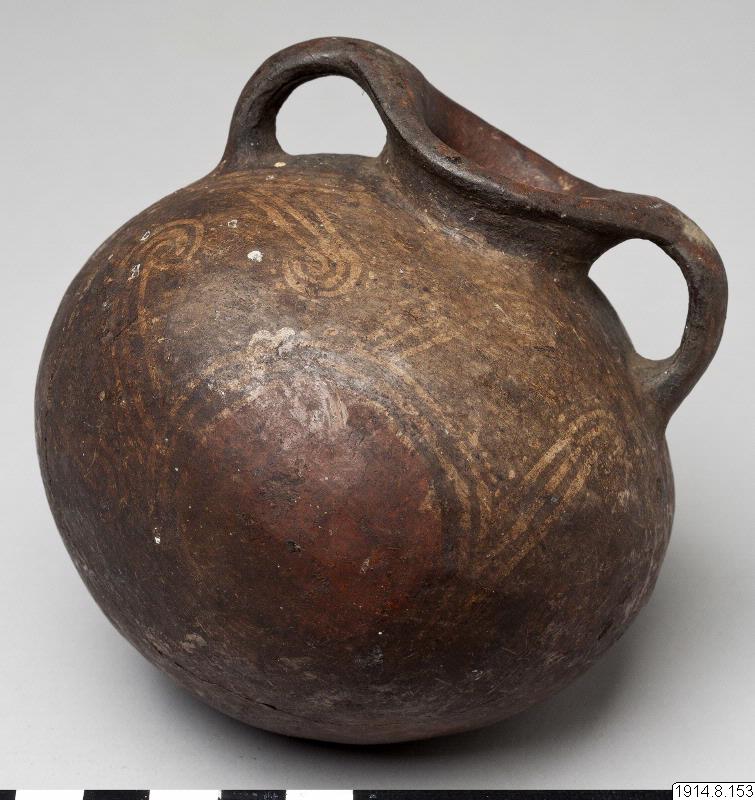 Även detta kärl intar på sätt och vis en särställning. Mönstringen är ej som så ofta annars utplånad (detta gäller åtminstone den ena sidan), men teckningen är ej distinkt och kontrasten ej stor. Grundfärgen gulbrun gul och sekundärdekorationen brun, ljusare än vanligt. Till bottenfärgen torde även höra et brunrött bälte, som går runt kärlet vertikalt och delar det i två lika stora delar. Ungefär mitt på sidan finnas två runda fläckar i samma färg som detta bälte, oeh dessa fläckar är placerade mitt emot varandra. Fläckarna är omgivna av linjer, och från dem utgå radiellt fem armar, bestående av tre linjer, vilkas ändar böja sig halvcirkelformigt. Liknande omgivande linjer och armar finns i anslutning till det vertikala bältet. Mynningen trång, halsen låg men mynningen är på två motstående partier utdragen i snibbar, som sluta i eller fortsätta med vackert böjda öron, som inte endast har samma form utan dekorationen uppvisar även överensstämmande element.
