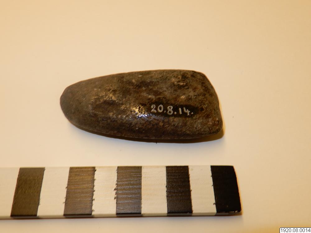 • Stenyxa av ljus sten. Längd 7,5 cm. Bredd 3,7 .cm.