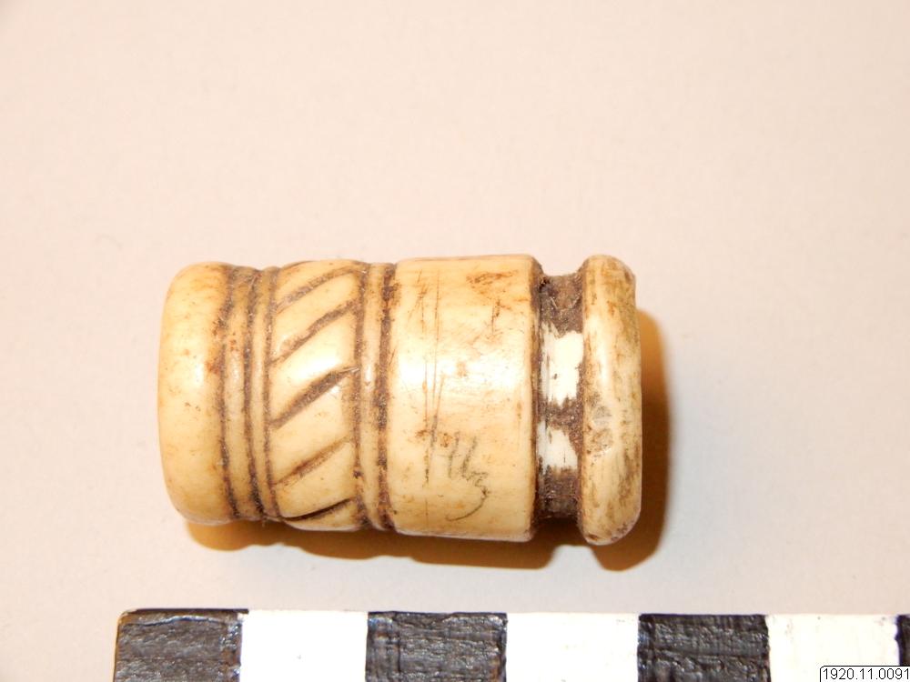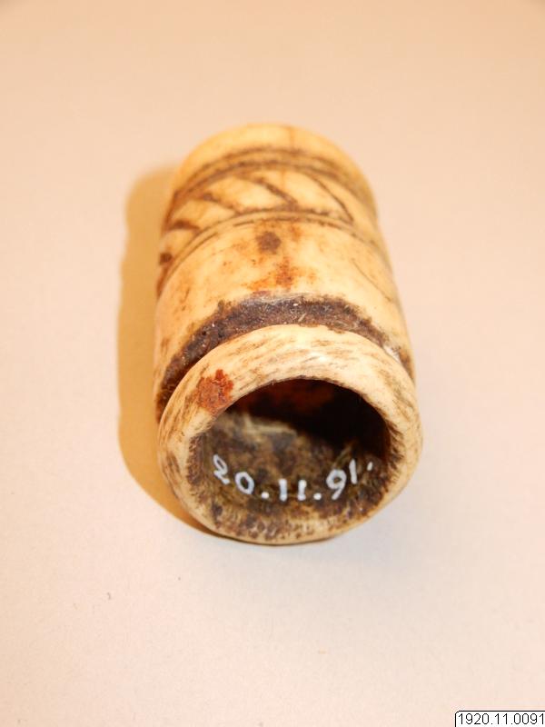 • Munstycke av ben, till kulpung. Dekorerat med inristade linjer.Höjd 304 cm. [ocr]