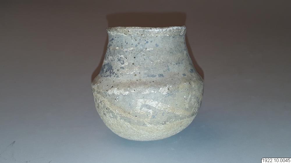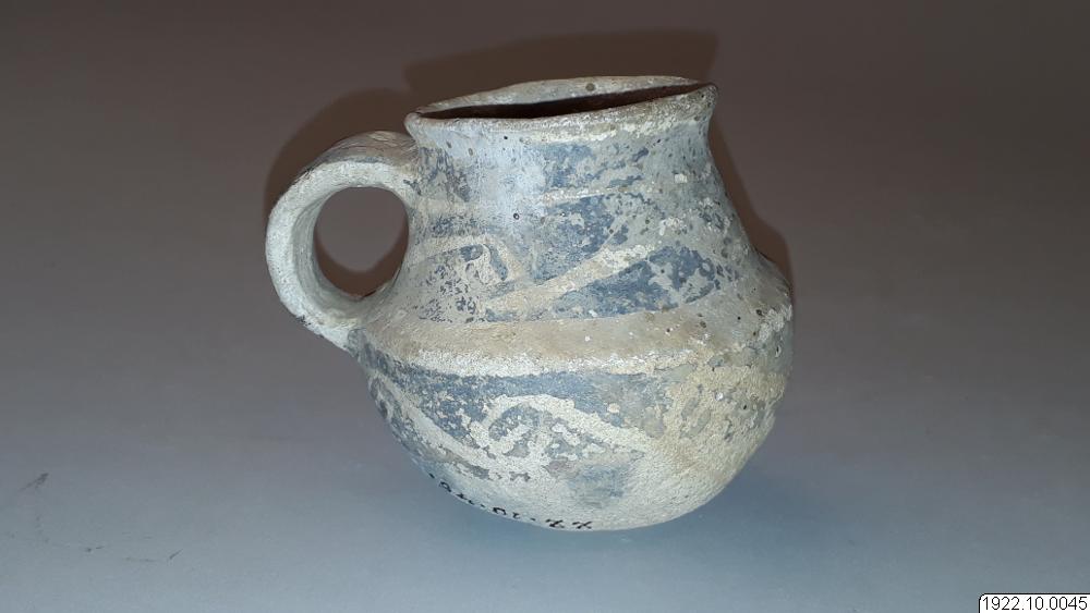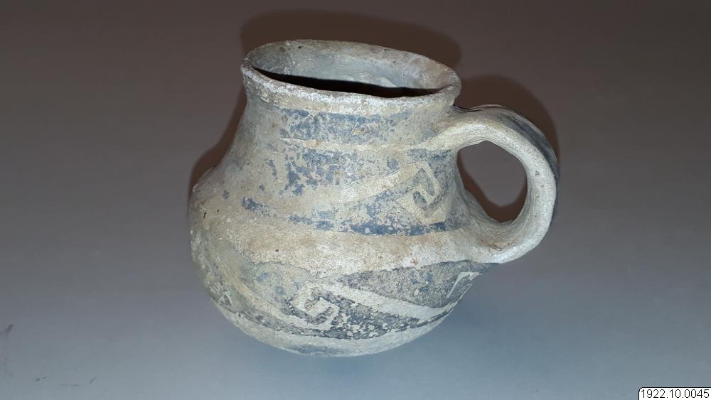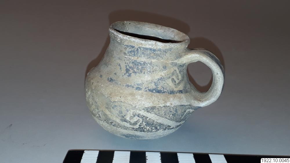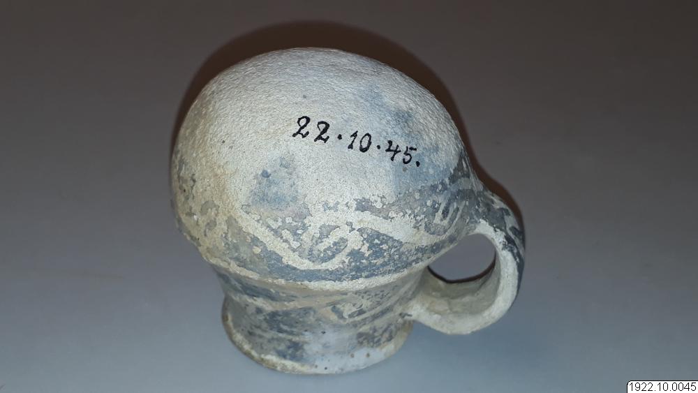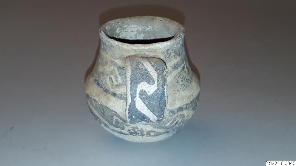 • Kruka. Liten, med grepe. Utsidan ornerad. Höjd 7,7 cm. Vidd 7,8 cm. [ocr]