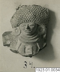 • Blomsterhuvudtrydnad. överoch underdål skadade. Höjd:.8:7,cm: (huvud). Se bildark. kartong 9A. Azcapotzalco Mexiko [ocr]