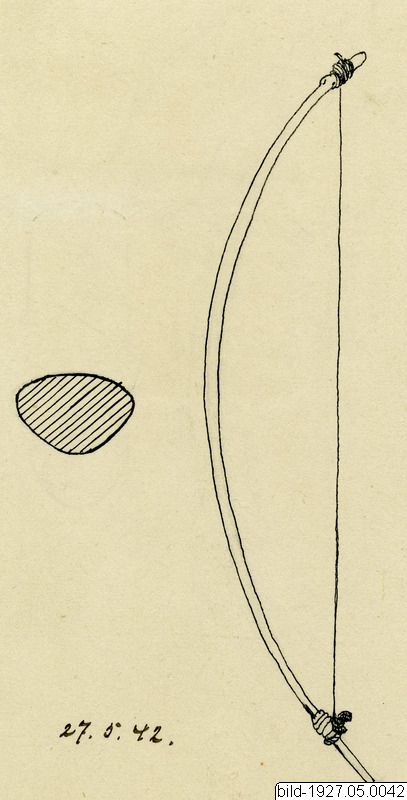 Böjning och tvärsnitt enl. fig. Ändarna avsmalnande. Strängen ett vänstertvinnat snöre av tre kordeler knuten om bågens ändar, i ena ändan mot en grenknöl, i den andra mot en bastlindning. Längd (mellan bågens spetsar) 129 cm. Strängens längd: 115 cm. Mittavstånd mellan båge och sträng: 20.5 cm. Bågens tjocklek 20 resp. 15 mm. [ocr]