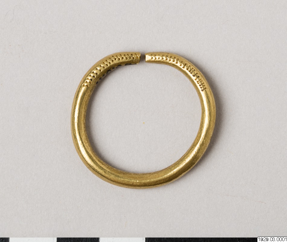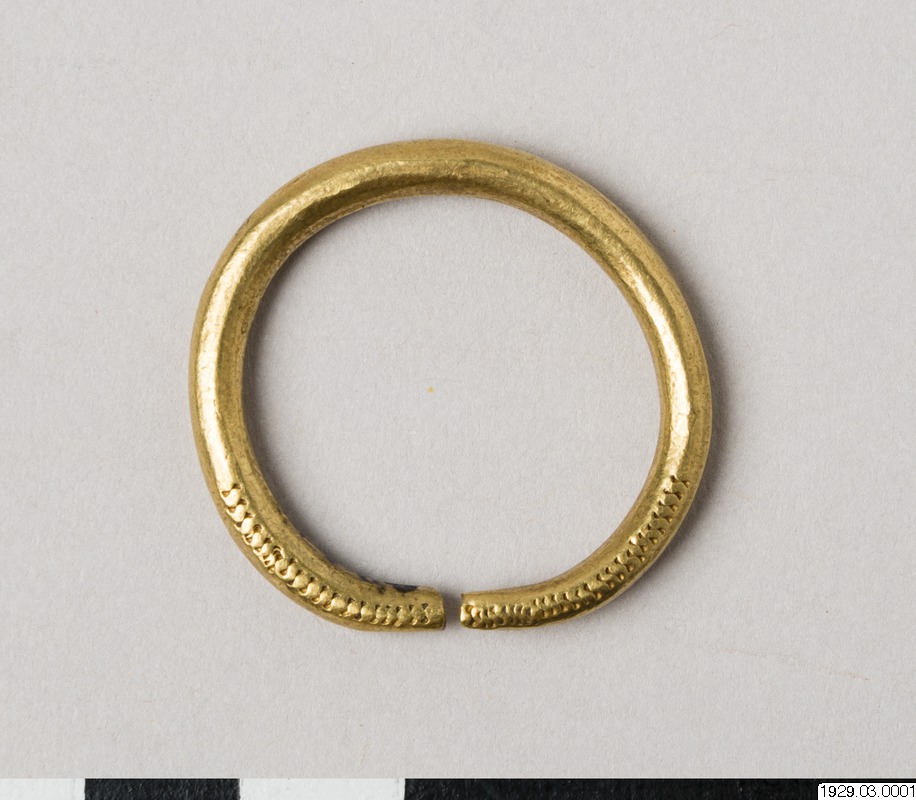 Guldring. Ringen är ej cirkelrund. Den är förfärdigad av en hopböjd, något olikformig guldstav och prydd med instansade S-formiga figurer. Vikt: 15 gr. Största diam. 3,3 cm. [ocr]