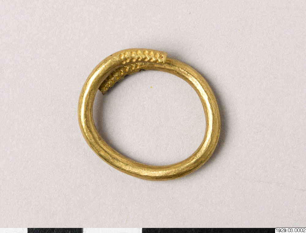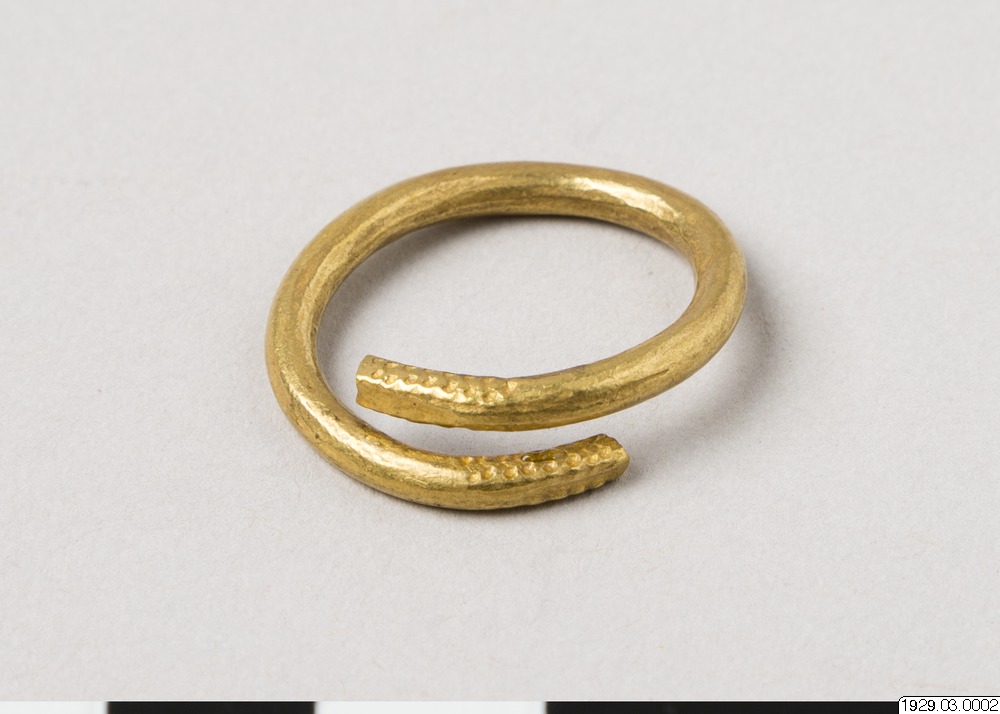 Guldring. Tillverkad av, en tunnare guldstav än nr 1, ändarna skjuter förbi varandra. Liksom nr1 prydd med instansade 8-formiga figurer, vilka deformerats, troligen genom hamring. Vikt: 8 gr. Största diam. 2,45 cm.