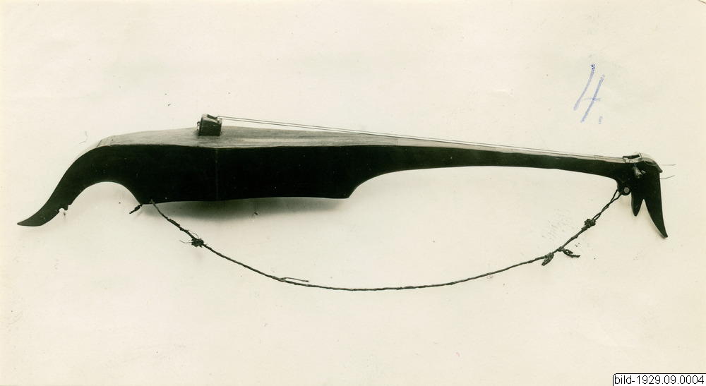 Musikinstrument. "Rebab", tvåsträngat tvåsträngat batakiskt. Hals och resonanslåda i ett stycke, resonansbotten och stall i ett. Lådan öppen i bottnen. Locket (resonansbottnen) fastlimmat. På halsens grepparti 5 "band". Halsändan ("snäckan") i form av ett djurhuvud av indonesiskt stiliserad typ. Strängarna av fibrer. Stämskruvarna två koniska pinnar, instuckna från motsatta sidor och fastklämmande den genom pinnhålet dragna strängändan. Bärband av en tygremsa. Från bataker i Brastadi, öbt i höglandet innanför Medan. Längd: 61 cm. Brastadi Sumatra BatakerStäng