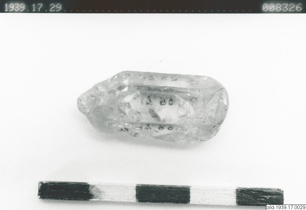 Föremål av bergkristall. Liten hängprydnad trol. av bergkristall med 4 planslipade sidor och en som är obearbetad. Kortändarna äro likaledes obearbetade, den ena, ganska spetsig, är försedd med ett från sidor borrat hål. Längd cm. [ocr]