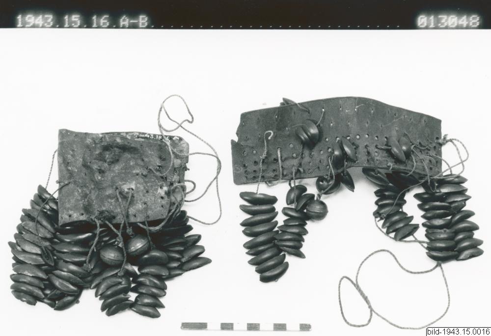 Daneskramlor? Två rektangulära läderstyc ken av något olika storlek (par?) med båtformiga bruna fruktskal uppträdda på snören, som äro fästa genom hål i lädret. Därjämte 2 resp. 3 mässingsbjällror fästa på samma., sätt. Att bindas om vristerna? Daneekramlor av fruktekal förekomma i västafrika, gamerun etc. Afrika. [ocr]