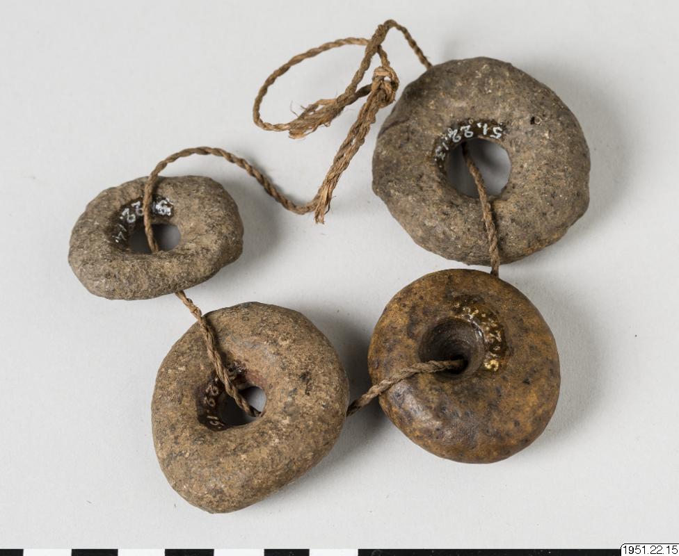 Stenring, klubbhuvud, i sten. Arkeologiskt fynd. 1951.22.0013, 1951.22.0014, 1951.22.0015 och 1951.22.0016 sitter tillsammans på ett snöre. Från området runt waghi-dalen.