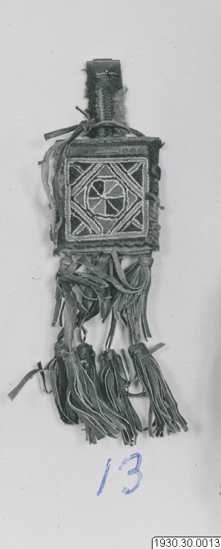 Väska. På framsidan prydd med ett brokigt broderi av färgat bomullsgarn i rött, grönt, gult, blått och vitt. Geometriskt mönster. I övre kanten en längre broderad läderstropp, i nedre kanten fem större tofsar av läderremmar.