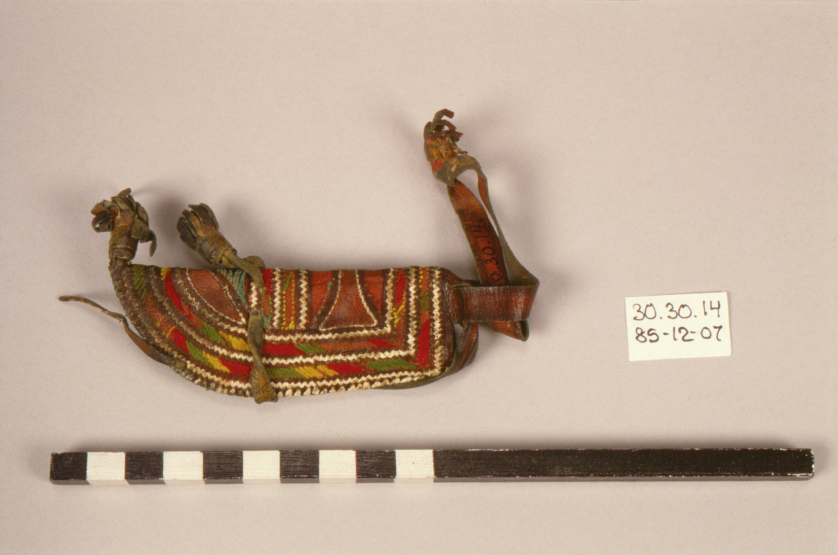Pung eller etui, för att ha kniv och småsaker i. Till formen som en knivslida, med ena kanten rak och andra bågformig. Bestående av ett stycke läder, vikt och med kanterna hopsydda. Rött läder dekorerat med mörkfärgade linjer och ett brokigt broderi av rött, grönt, gult och blått bomullsgarn samt smala vita remmar. Inuti ett dubbelvikt stycke läder, bildande tre fickor. Vid mynningen tre remmar, av vilka två förenats till en ögla. Omkring pungen en lädergördel med tofs och i spetsen en lädertofs.